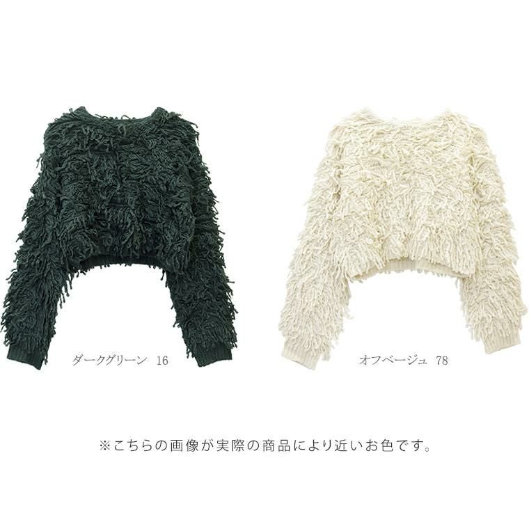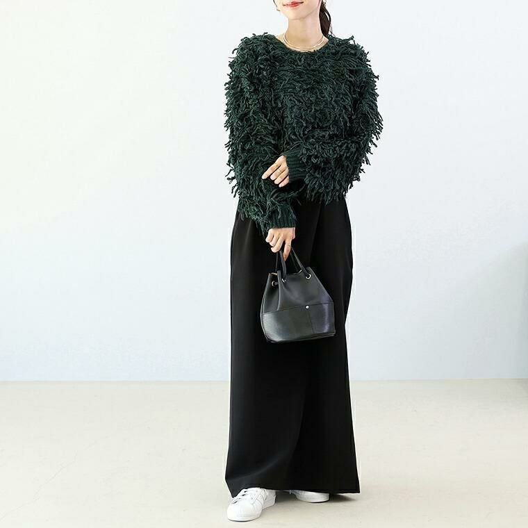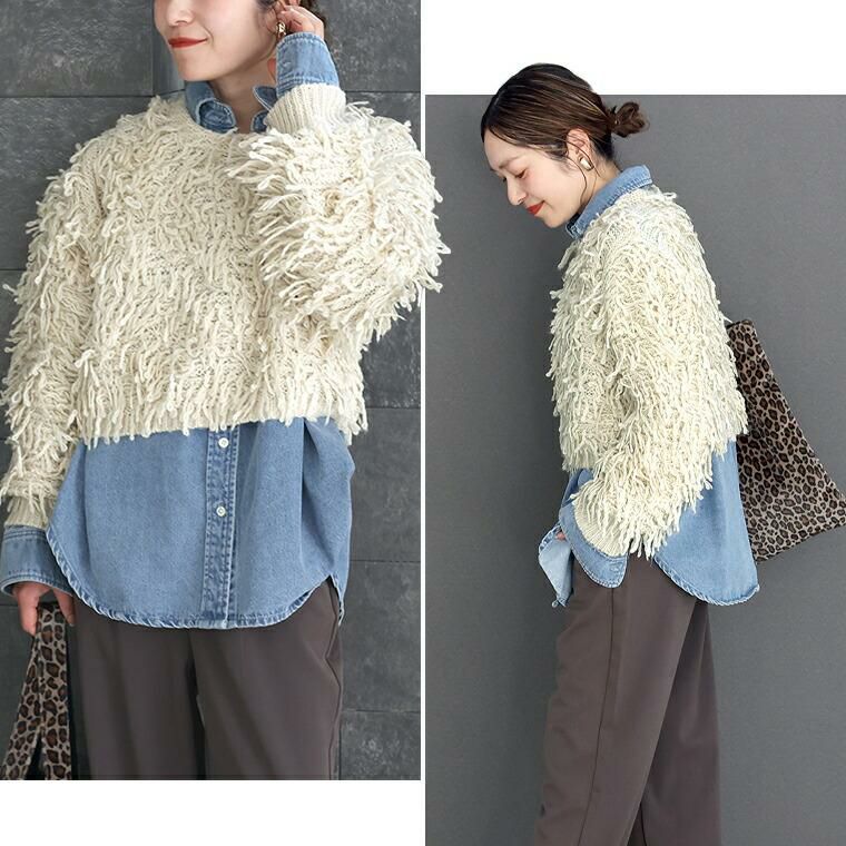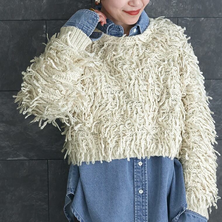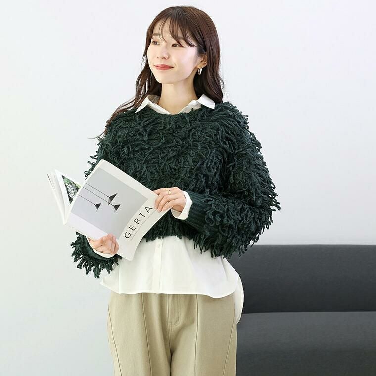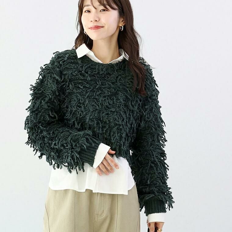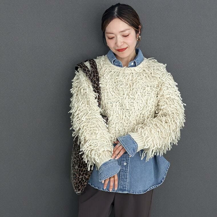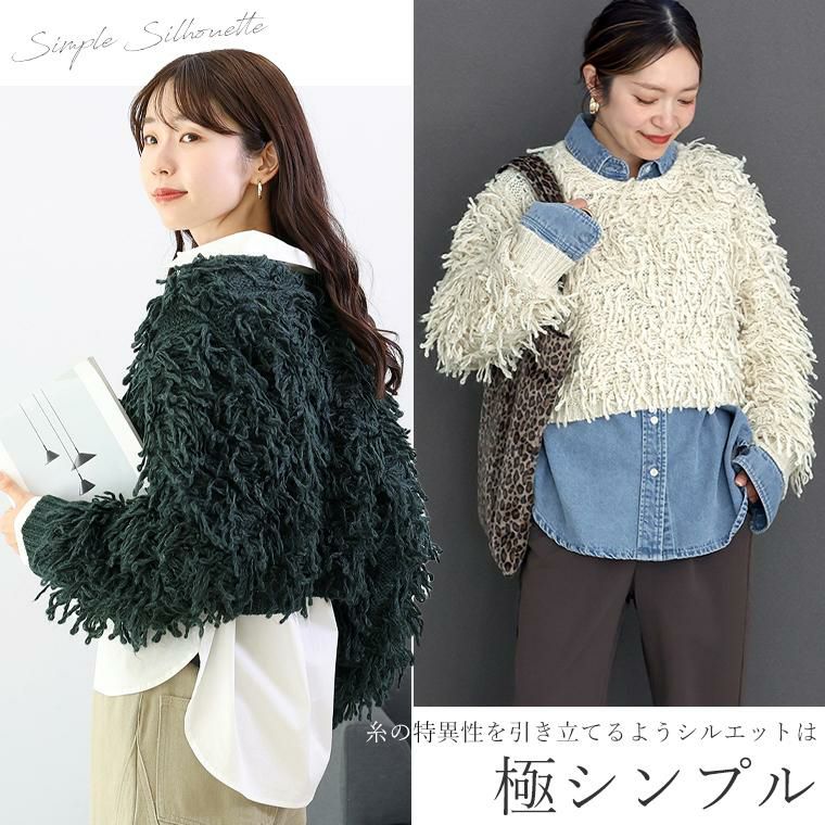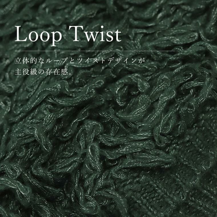 ねじりを加えたループモチーフがリズミカルな主役級の存在感のニットプルオーバー。今旬の丈感にワイドな身幅がトレンドライク。スタイルアップが叶います。顔周りはすっきりと見せるクルーネックで、袖口と裾はリブ切替です。表面変化のあるニットで気分もあがるアイテムです。