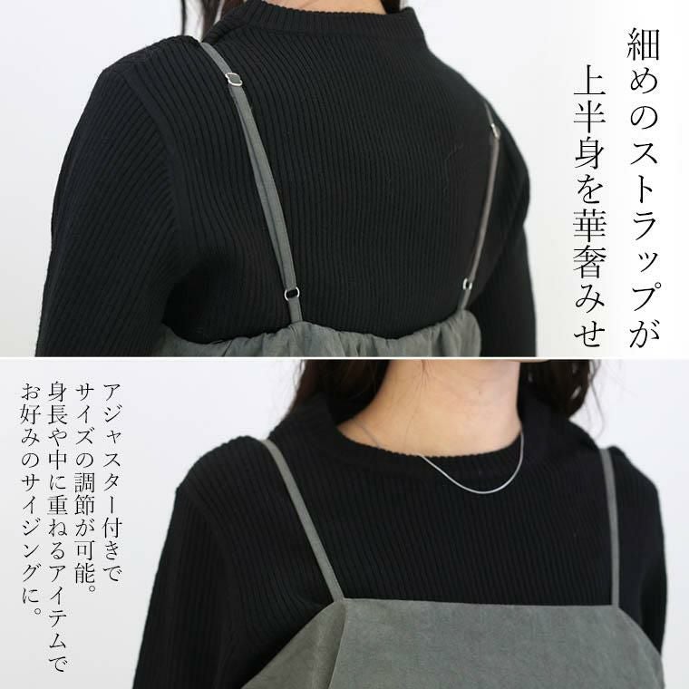 着丈は肩紐40cmでかかとから10cm下。ストラップで丈は調節できます。最大限に短くすると床にズらずに穿けますが脇繰りがしまってしまうので厚手のインナーは無理そうです。起毛感のある柔らかい生地感で気持ち良いです。