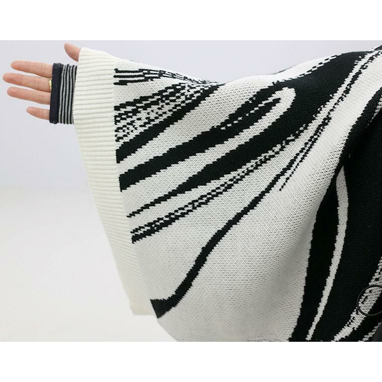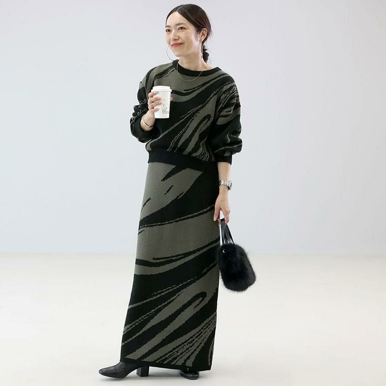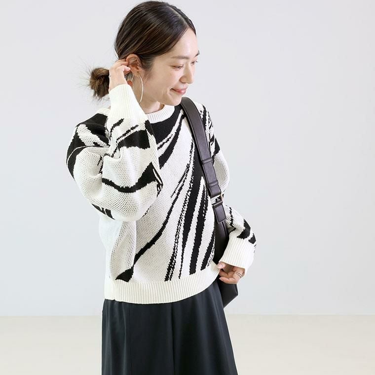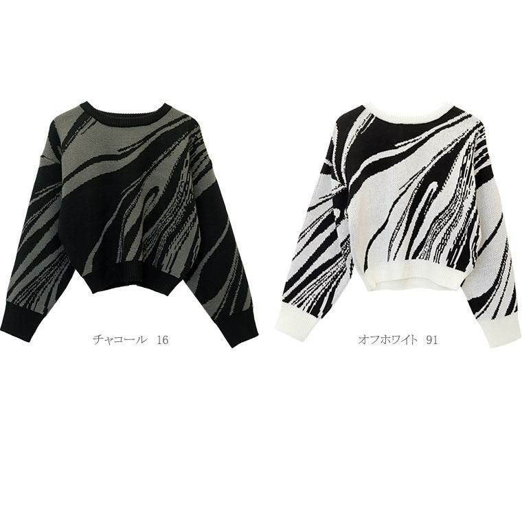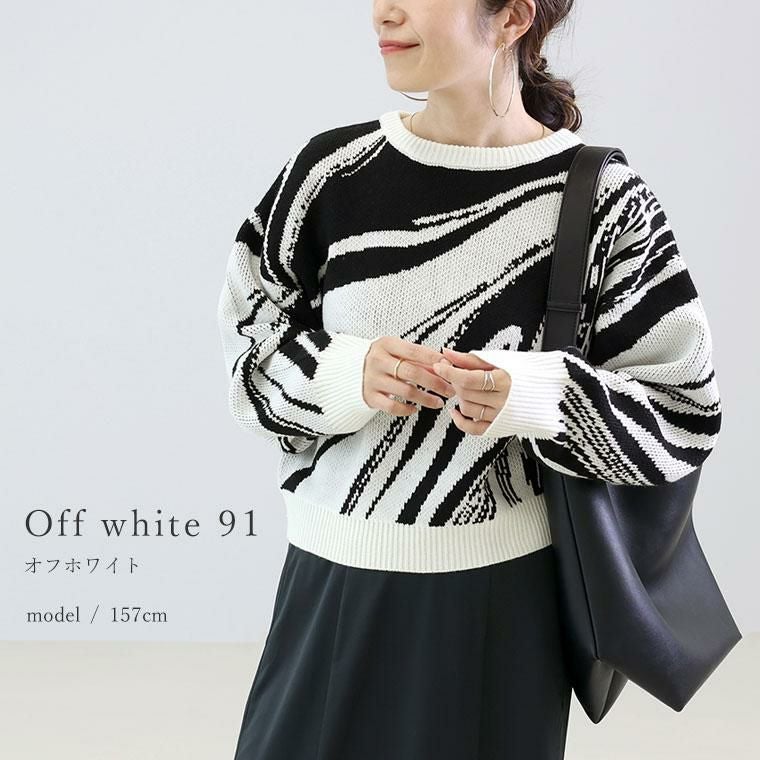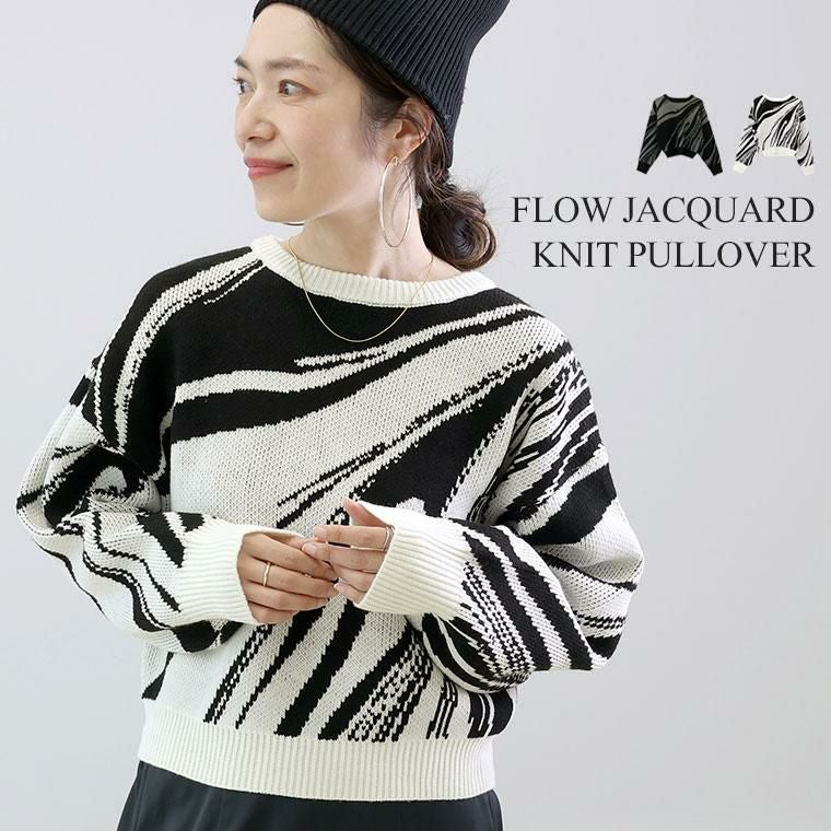 アシンメトリーな流線柄がアーティスティックなジャガードニット。流れるようなモチーフが印象的です。模様を引き立てるシンプルなシルエット。ワイドな身幅にジャストの着丈がトレンドムード。開きすぎないクルーネックが上品。落ち着いたトーンの配色でキレイめコーデにも取り入れやすい。広めの身幅と袖幅でインナーがしっかり着込めるのも嬉しい。単調になりがちな秋冬コーデの鮮度を上げてくれるアイテムです。