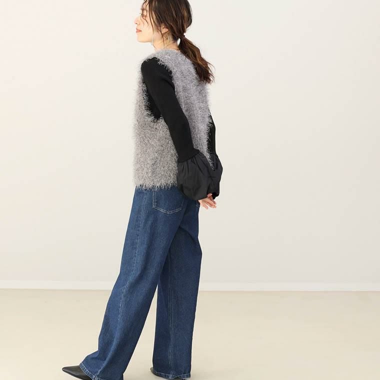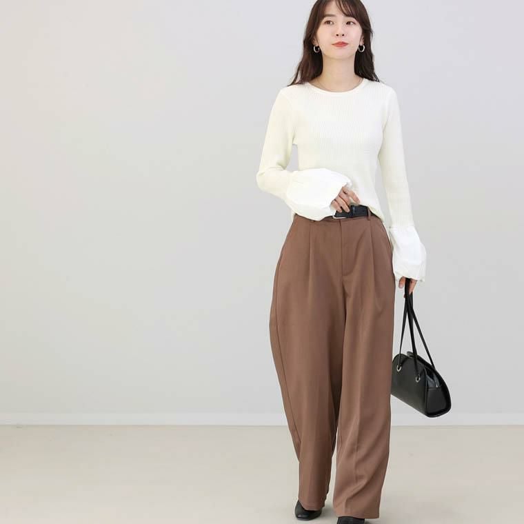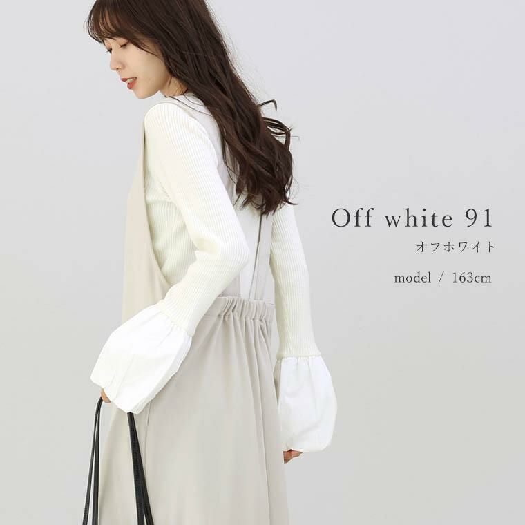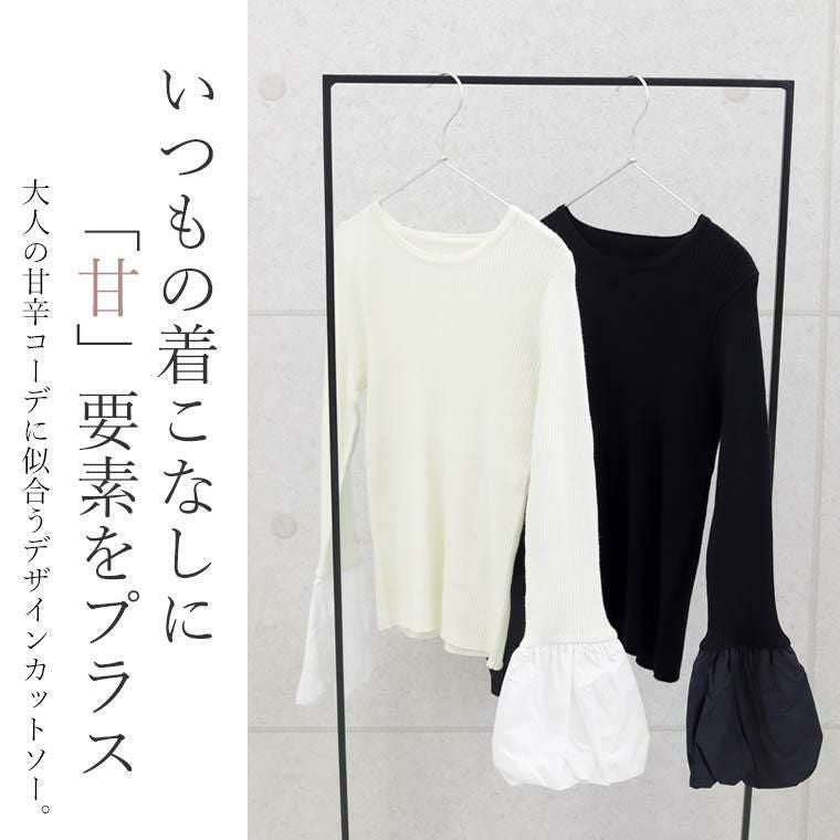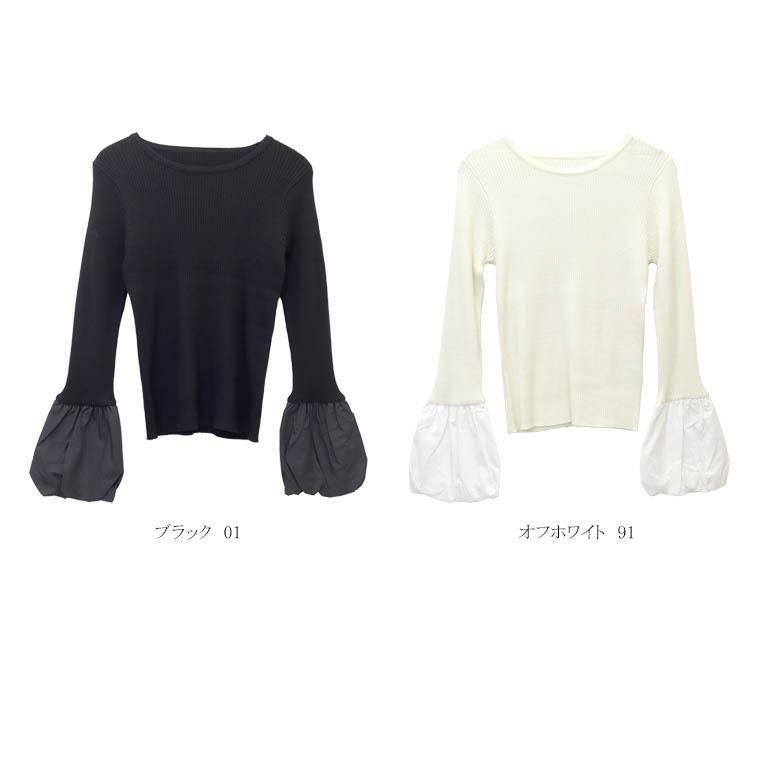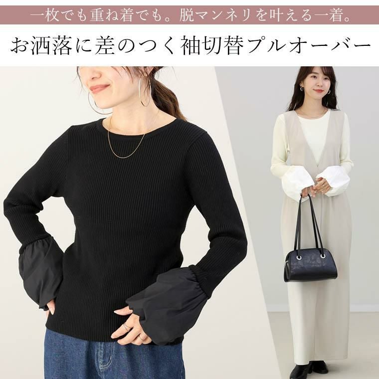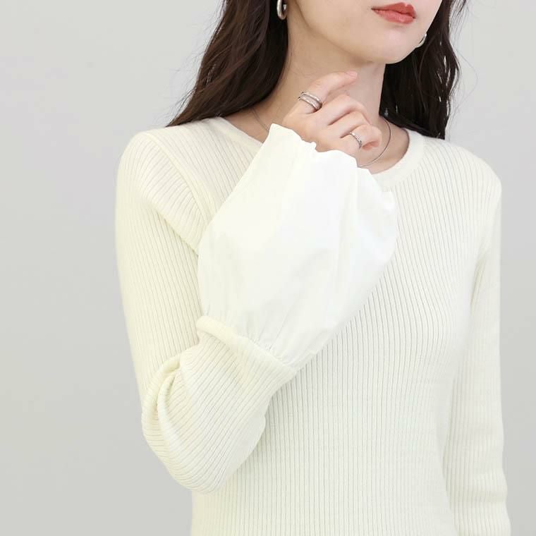 一枚でもレイヤード使いでもしっかり華やぐ袖デザインニット。ニット×布帛の異素材使いで着心地の良さとお洒落を両得。立体感あるバルーン袖が大人可愛く手元を華やかにみせてくれます。同色の切替えなので甘くなり過ぎず大人コーデに取り入れやすいのも嬉しい。ニット生地は凹凸のあるリブ編み。細い畝が縦ラインを強調し、すっきりみせてくれる視覚効果も。伸縮性に優れ、快適な着心地をお届けします。秋、冬、春と3シーズン活躍するハイゲージニットでたっぷり着まわせます。