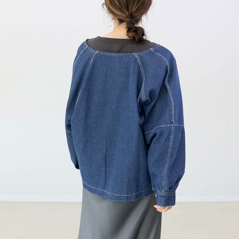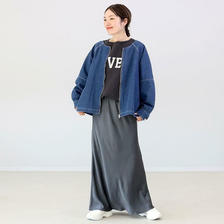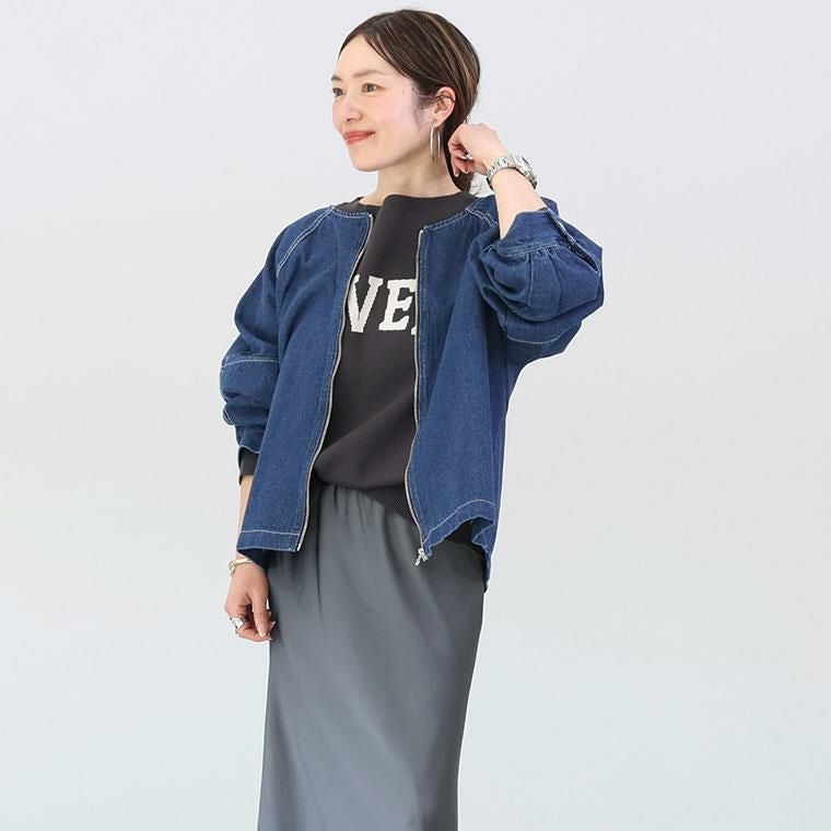 春に欠かせないデニムジャケットを旬シルエットに落とし込んだアイテム。ぽってりとしたバレルシルエットの袖デザインがトレンドムード。綿100%・10ozの本格デニムです。硬すぎず薄すぎない、扱いやすい素材感です。ラグランスリーブが肩幅のラインを曖昧にし、華奢見えを誘います。ゆとりのあるオーバーサイズ。やや抜き気味で羽織ると立体感が生まれ、抜け感と大人の余裕が漂います。袖口のマットなシルバーボタンとフロントファスナーがアクセント。カジュアルになりがちなデニムアイテムをキレイめコーデにも合わせやすいシルエットに昇華した、進化形デニムジャケットです。