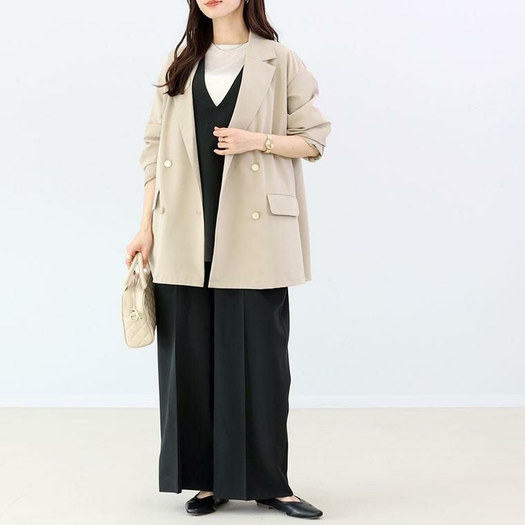 シンプルなトップスに重ねるだけでオシャレ上級者になれるオールインワン。こだわりのデザインと丁寧な縫製が、大人の高見えスタイルを叶えます。ワイドパンツにベストを重ねたようなセットアップデザインで、立体感ときちんと感をプラス。シワになりくいやや薄手のツイル素材でいつでも美しい佇まいに。裏地が無く季節を問わず着られる生地感で長く愛用いただけます。深Vネックフロントがデコルテを美しく魅せ、顔周りをすっきりと演出します。フラップのアクセントが、シンプルながらも洗練された印象に。パンツのサイドにはサイドポケット付きで機能性も抜群。バックはふわりと広がるペプラムデザインで気になる腰回りをカバーします。一枚で着こなしが完成する、大人のためのオールインワンです。