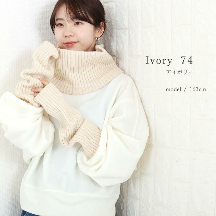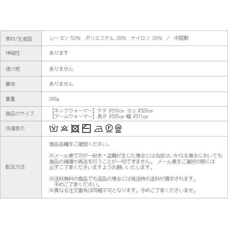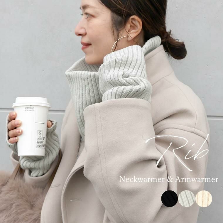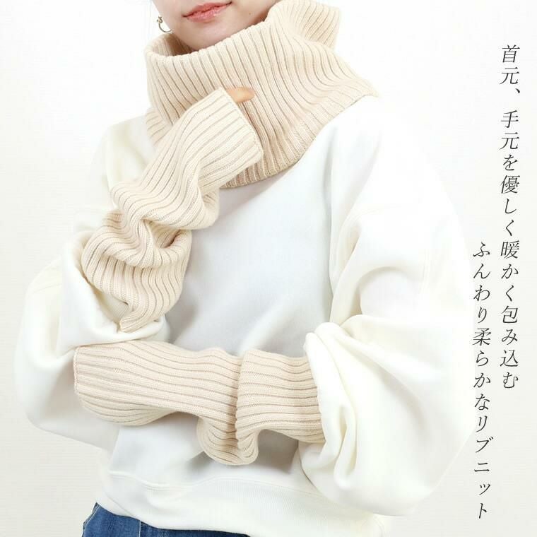 リブ編みネックウォーマー&アームウォーマー 実用性とトレンドを両得できるアームウォーマーと 同じニット素材のネックウォーマーがセットになった 防寒性抜群の旬アクセサリー。通勤やお買い物など お出かけ時はもちろん、お家での冷え対策にも活躍 してくれる便利なアイテムです。素材にレーヨンと ナイロンを編みこむことで、しっとりふっくらとした 風合いに。やや太めのリブで大人の女性に 相応しい雰囲気に仕上げました。