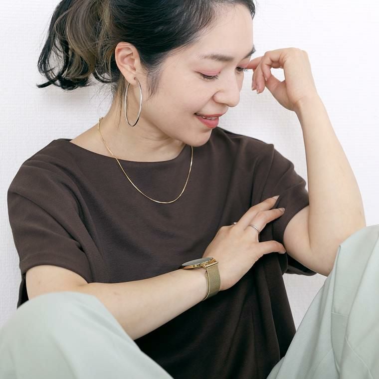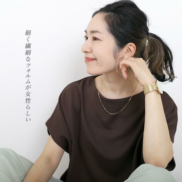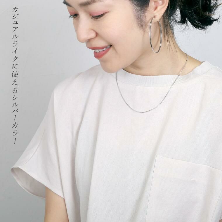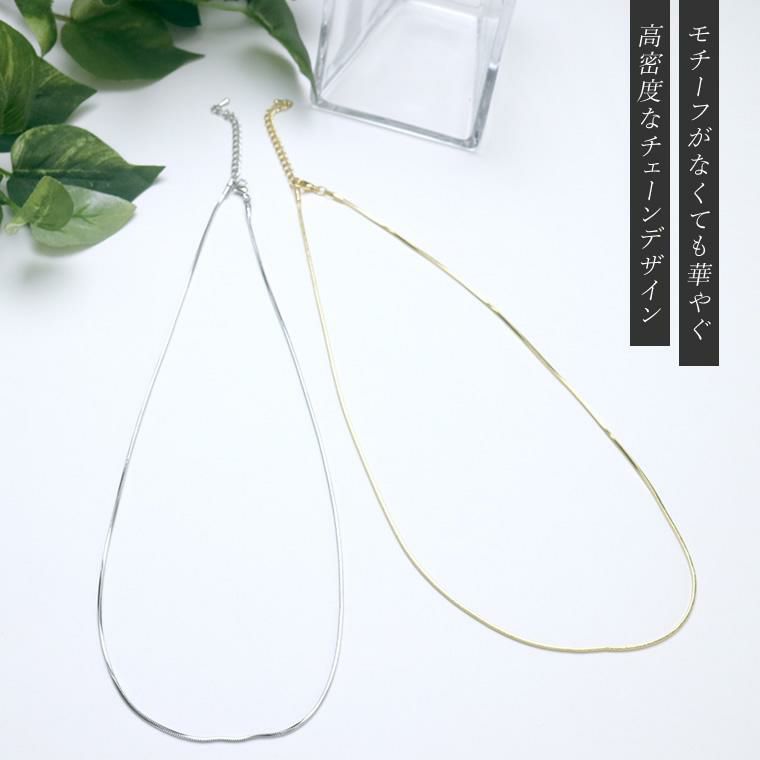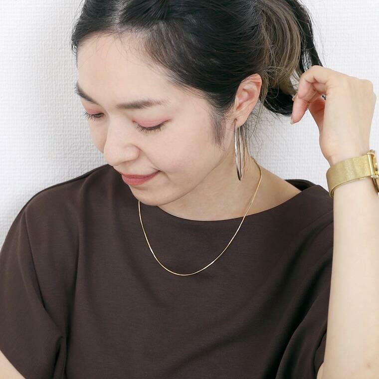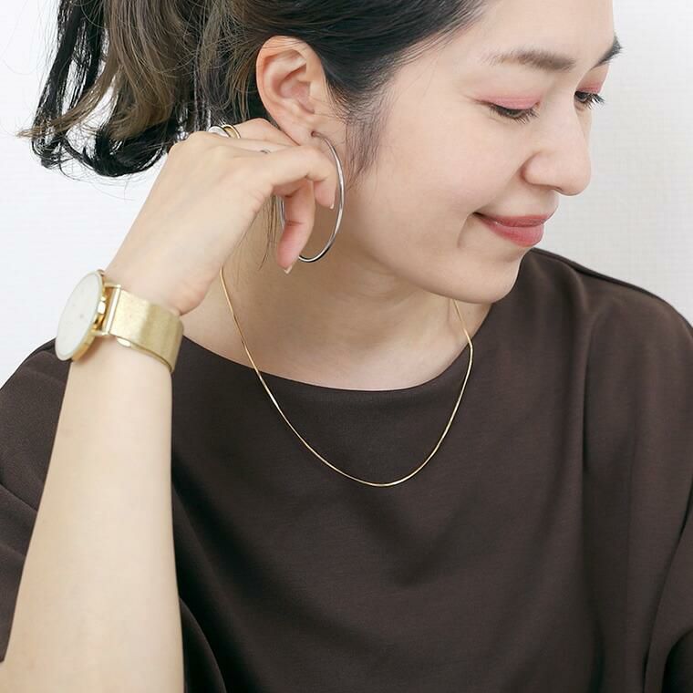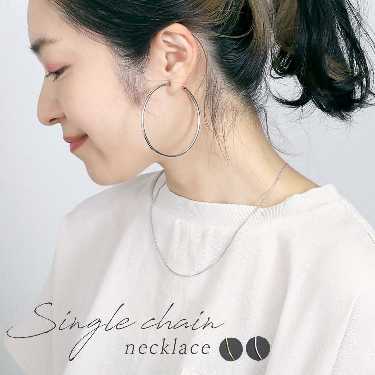 シングルチェーンネックレス オールシーズンで使えるシンプルなショートネックレス。 トップがなくても華やぎをお約束。コーデの邪魔をしないから 多様なシーンで活躍します。四角のパーツを縦と横の交互に 組み合わせたつくりは、密度が高く存在感抜群。 デイリーからオフィスやフォーマルシーンなどマルチに対応◎ 一本はもちろん、重ね付けてもおしゃれです。 女性らしいゴールドとカジュアルなシルバーの2種をご用意。