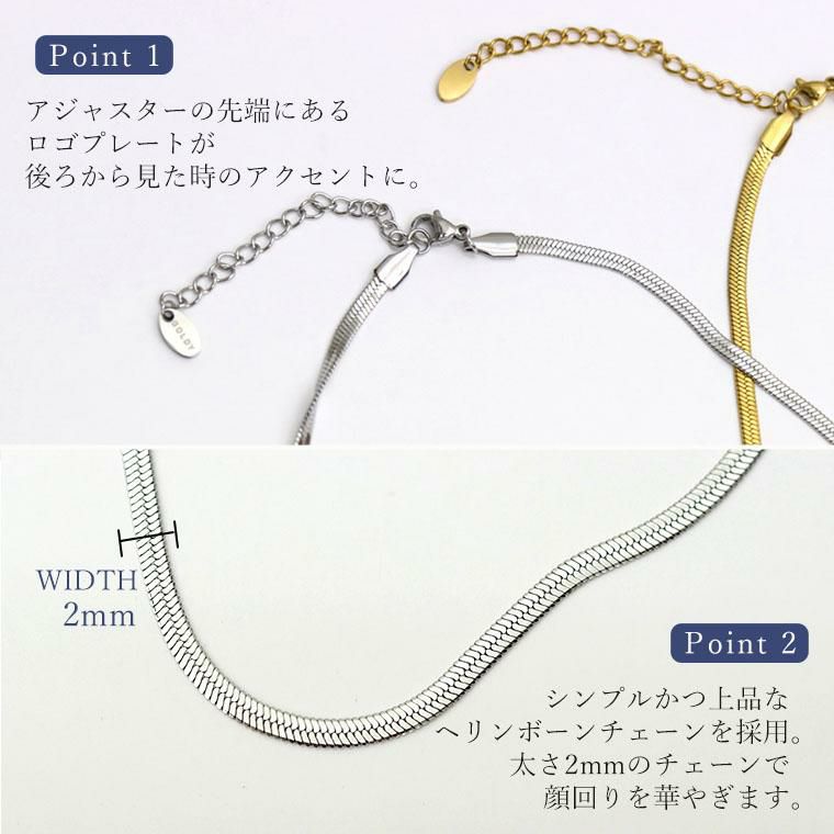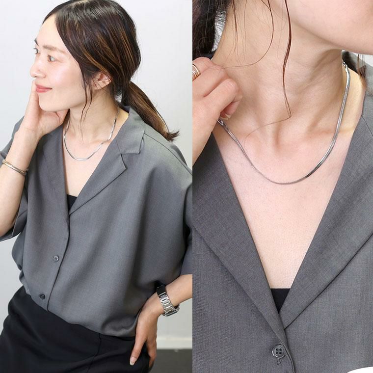 普段使いに最適な耐久性に優れたステンレス素材のシンプルネックレス。水や汗に強いので錆びにくく、変色しにくい。さらにキズがつきにくく、金属アレルギーが比較的起きにくいステンレス素材は、様々な方におすすめです。華奢でフラットなヘリンボーンチェーンのショートネックレスは、どんなスタイルに合わせやすく一本は持っておきたいマストアイテム。お手持ちのネックレスと重ね着けするレイヤード使いもおすすめです。シーンを選ばず使えるアイテムです。