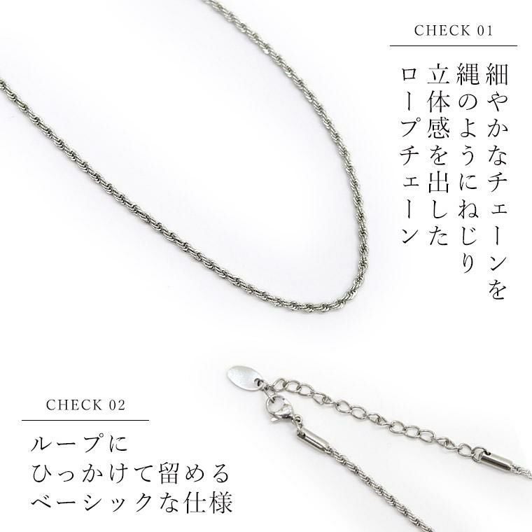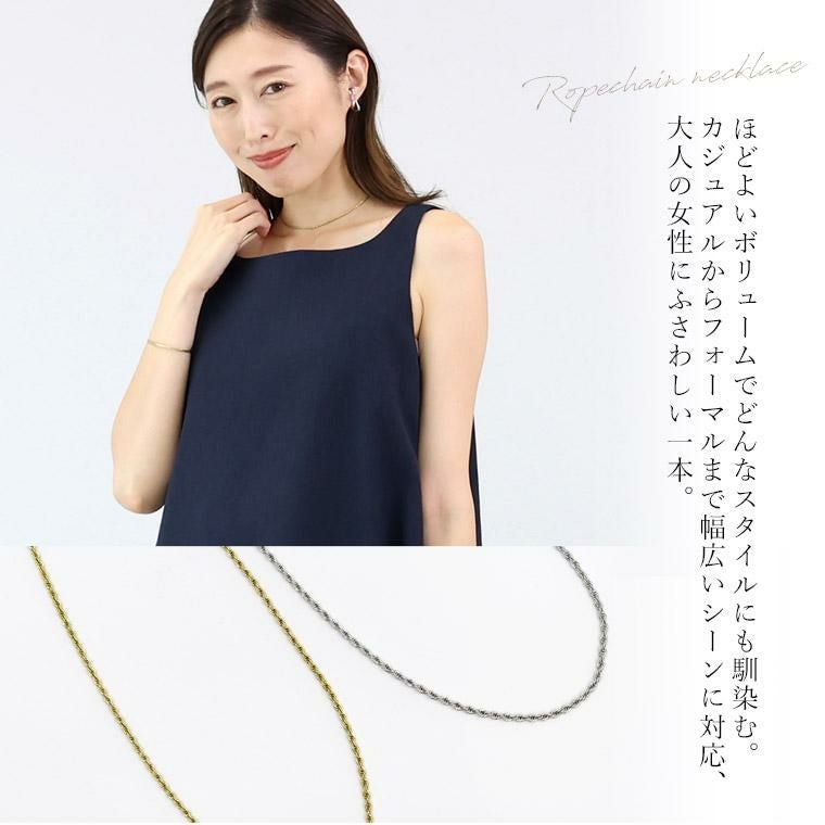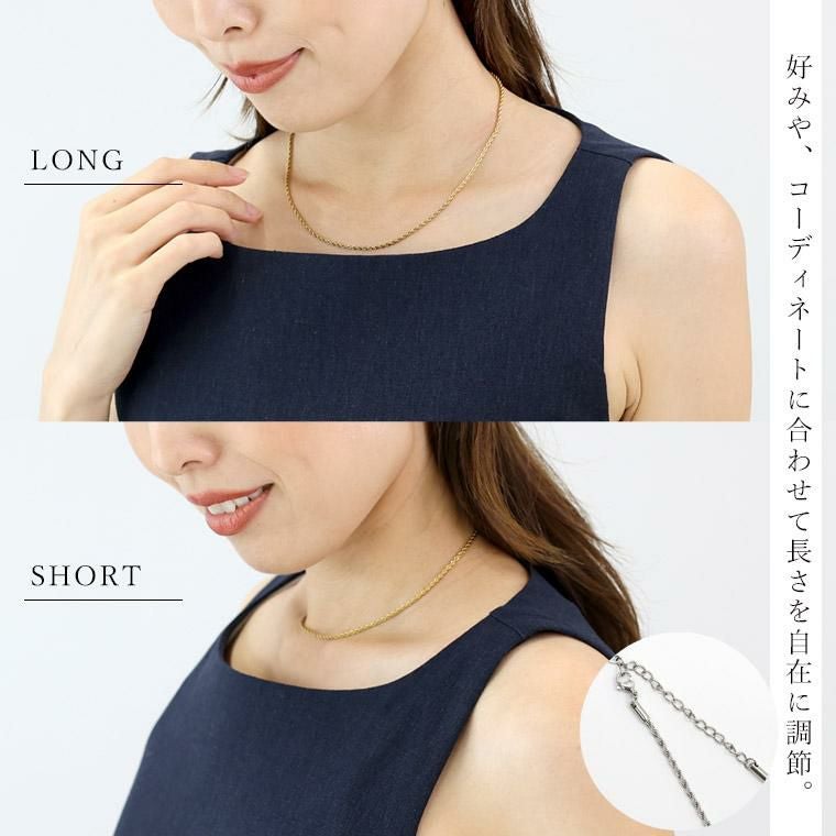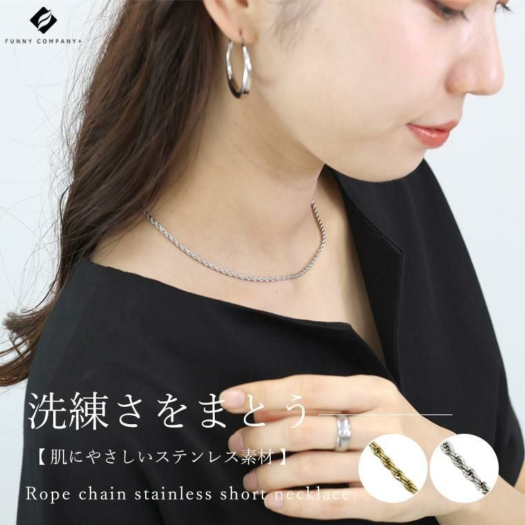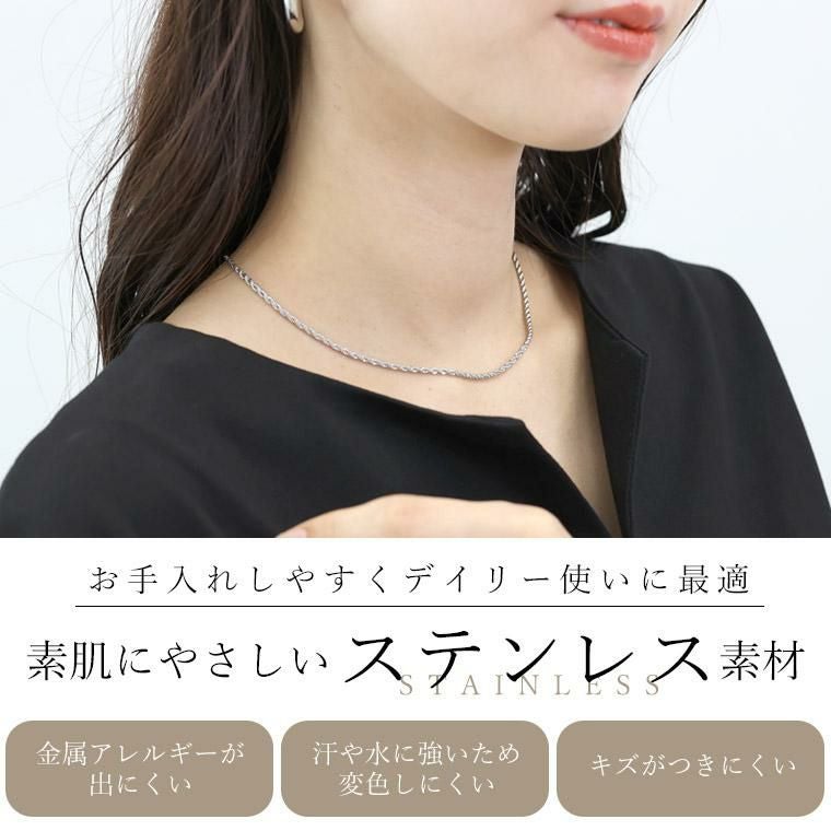 華奢なロープチェーンが首元に美しく映える、大人の為のショートネックレス。素材にはキズがつきにくく、お手入れしやすいステンレスを使用。金属アレルギーが出にくく、汗や水にも強いため変色しにくいので、デイリー使いにも最適です。ほどよいボリューム感でどんなスタイルにも馴染みやすく、重ね付けにもおすすめ。カジュアルからフォーマルまで幅広く活躍してくれる一本です。