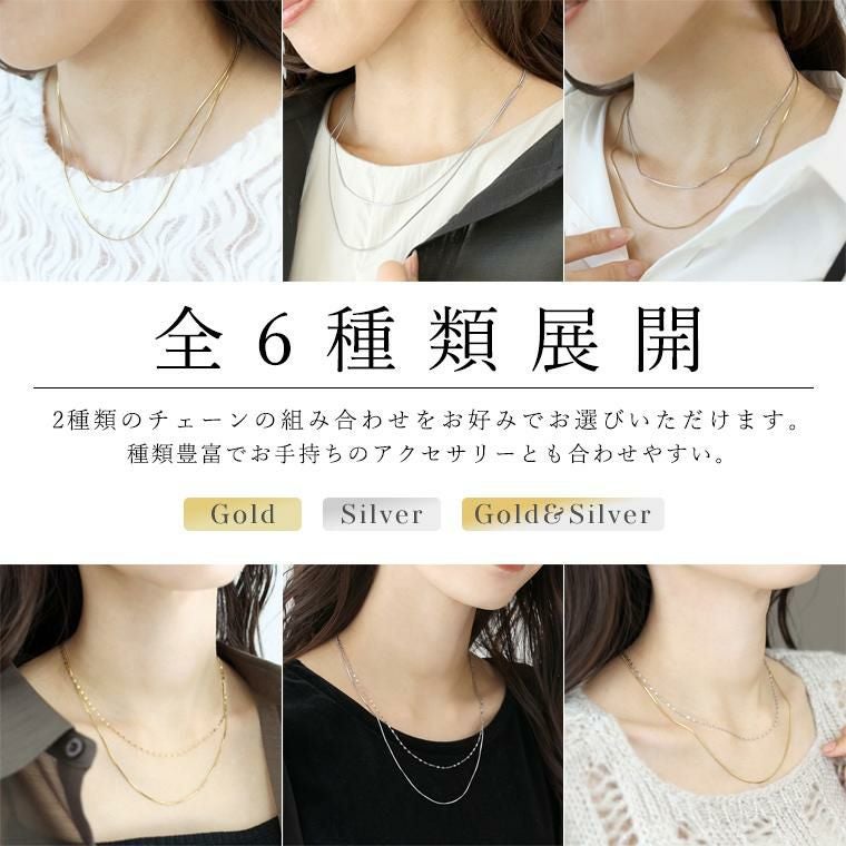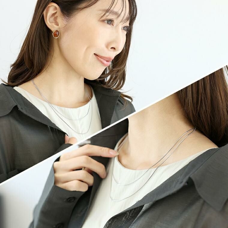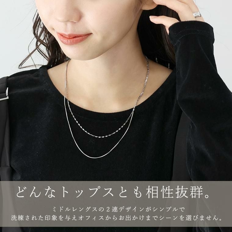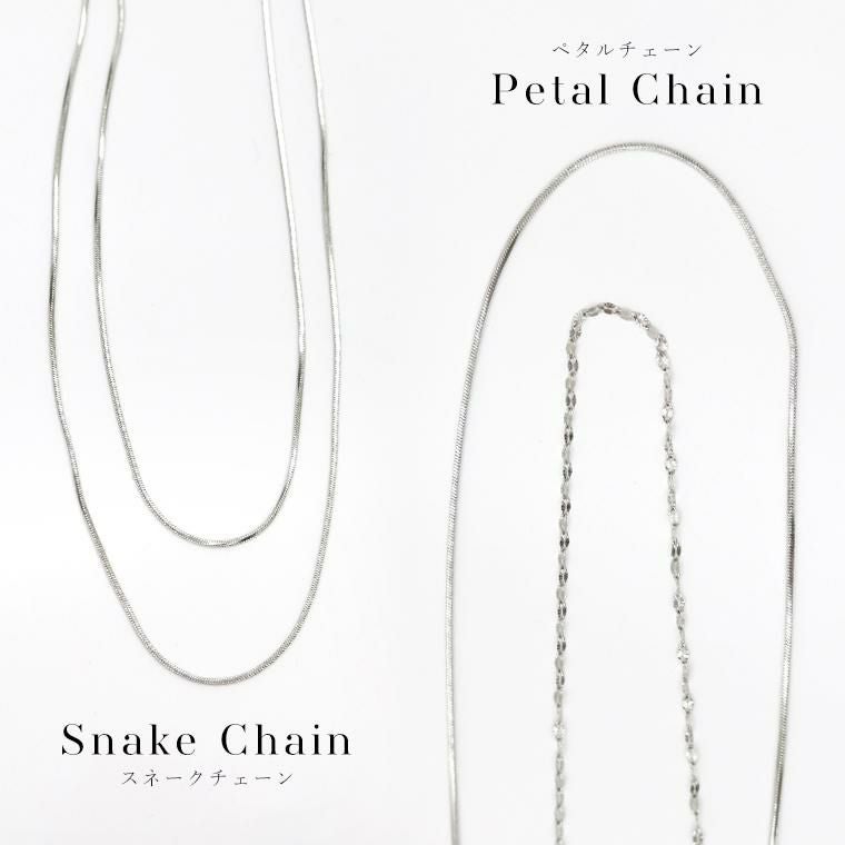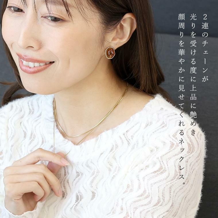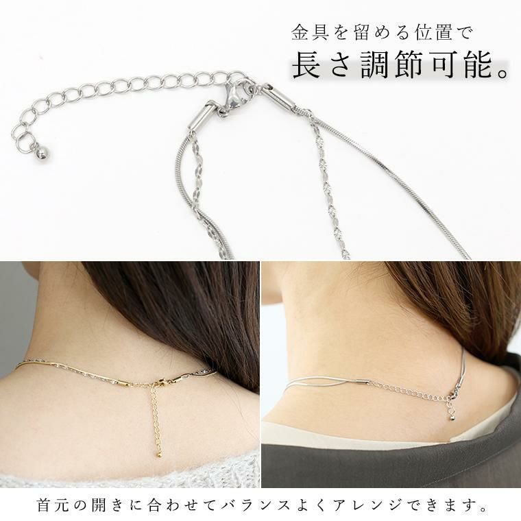 2連のチェーンが光を受ける度に上品に煌めき、顔周りを華やかに見せてくれるネックレス。安心のサージカルステンレス素材で錆びにくく変色しずらいので、敏感肌の方も安心して身に着けられます。シンプルで洗練された印象を与え、オフィスからお出かけまでシーンを選びません。しなやかで大人っぽい雰囲気を演出するスネークチェーンと、花びらのような小さなパーツが煌めく、可憐で女性らしい印象のペタルチェーンの2種類のチェーンの組み合わせをお好みでお選びいただけます。金具を留める位置で長さ調節が可能。首元の開きに合わせてバランスよくアレンジできます。