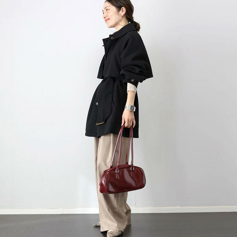 長い持ち手で肩掛け、手持ちどちらでも使えるミニボストンバッグ。今季注目のスリムなフォルムが特徴でスタイルに加えるだけで今年らしい印象になります。見た目はコンパクトながらも、スマホやポーチはもちろん、長財布も収納できる使い勝手の良さが魅力です。底板付きなので自立できるからきれいめなコーデにもマッチします。