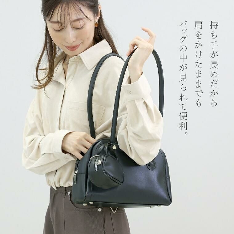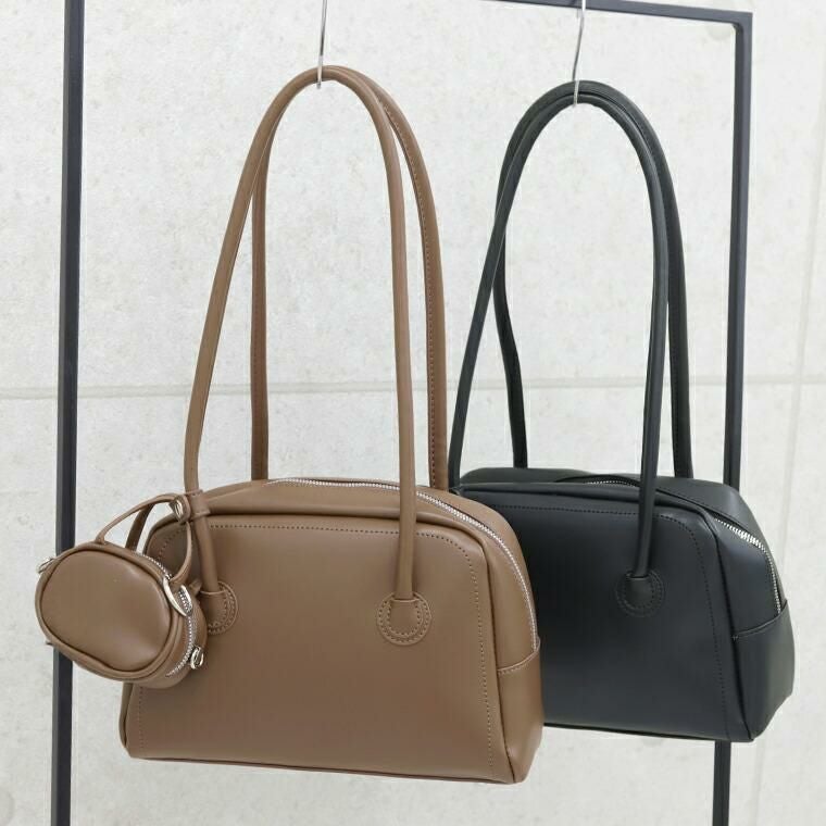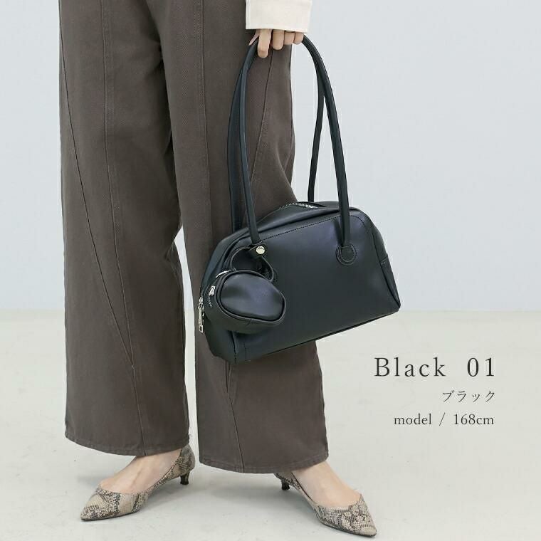 コロンとしたバッグチャームがアクセントとなるボストンバッグ。マチがしっかりあり見た目以上の収納力です。開閉部はクールなアクセントとなるダブルファスナー。底には鋲がついており、傷から守ります。肩にかけやすく、手持ちもしやすい使いやすいやや長めの持ち手です。バッグチャームにはストラップもついていて便利。リップ、小銭入れ、キーケースなど小物収納に使えます。