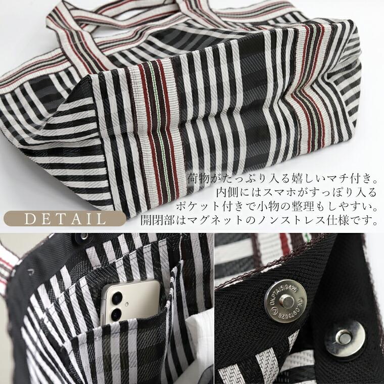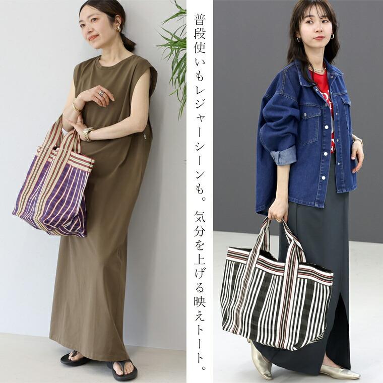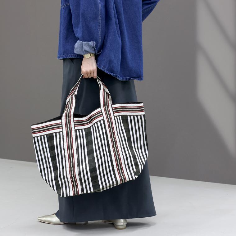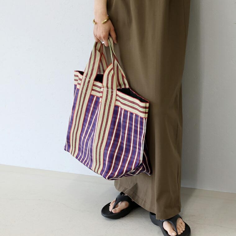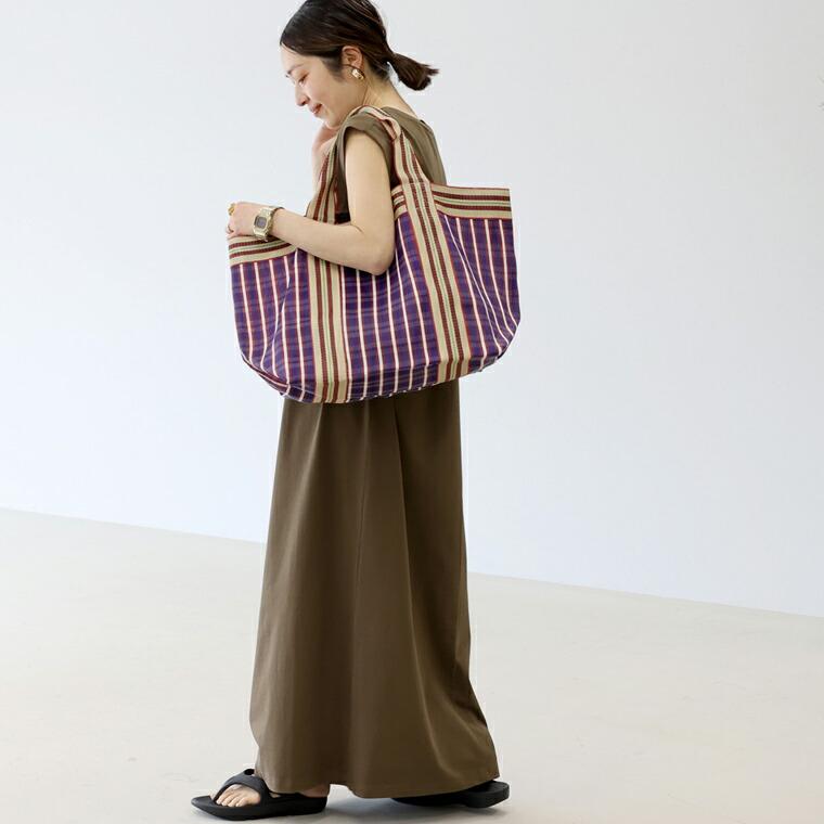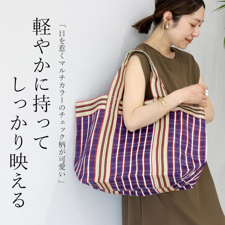 「軽やかに持ってしっかり映える。」日常にもレジャーにも頼れる、夏の主役トート。マルチカラーのチェック柄で持つだけでコーデのアクセントになります。リサイクルプラスチック素材で、環境に配慮したインド製のサスティナブルアイテムです。たっぷり荷物の入る大容量サイズでなにかと荷物の増えるレジャーやピクニックなどアウトドアシーンにもおすすめ。一泊二日分の着替えもすっぽり、プチ旅行にも頼れます。軽量設計で荷物が多い日も負担になりにくいのが嬉しい。水や汚れにも比較的強く、扱いやすいのも魅力です。