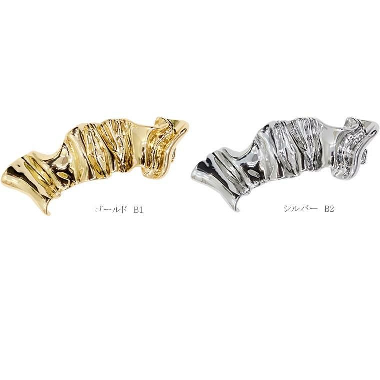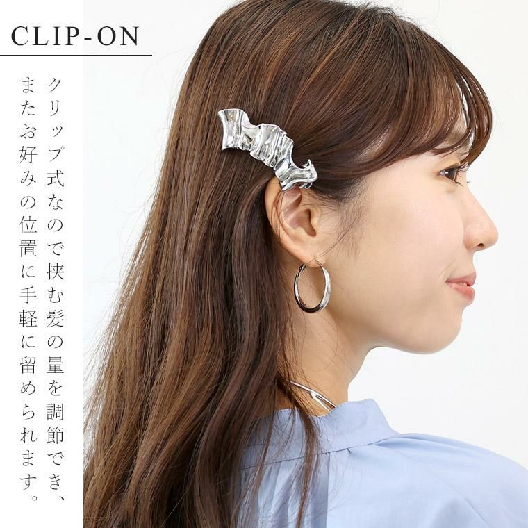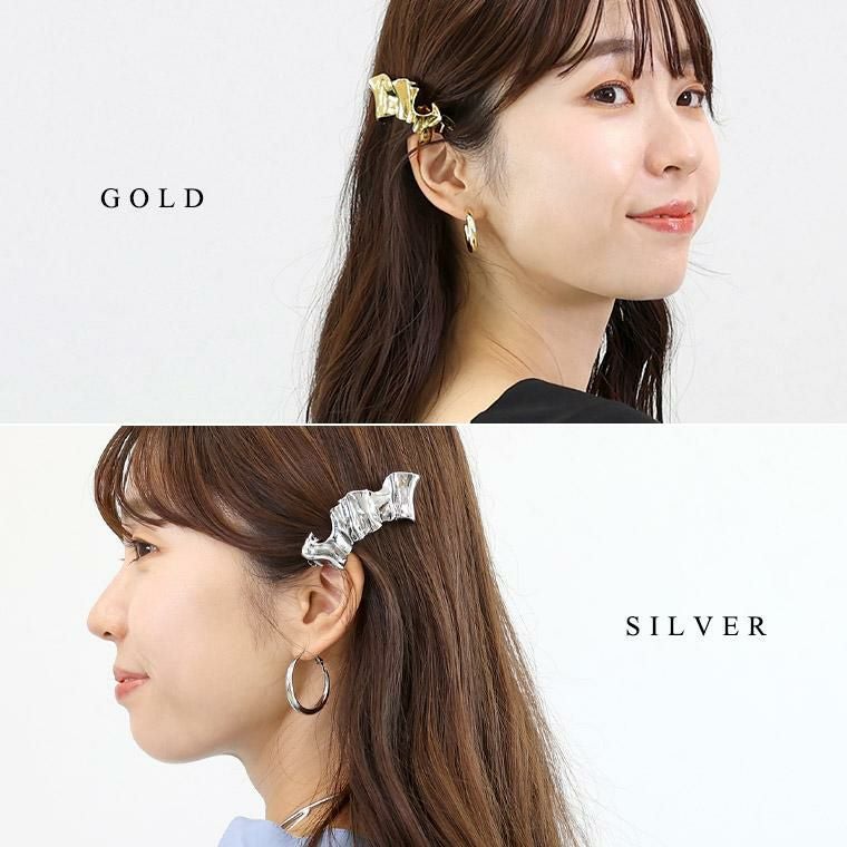 ぽってりとした厚みのあるデザインが存在感抜群。クリップ式なので挟む髪の量を調節でき、またお好みの位置に手軽に留められます。クリップ部分には凹凸が施され滑りづらい仕様です。まとめ髪にもハーフアップにはもちろん、フロントやサイドにピンのような感覚でアクセント使いにも。上品な艶めきを添えるゴールド・シルバーの2色展開。デイリーからフォーマルまで使える万能アクセサリーです。