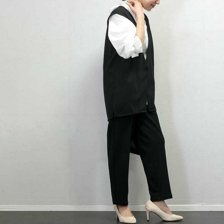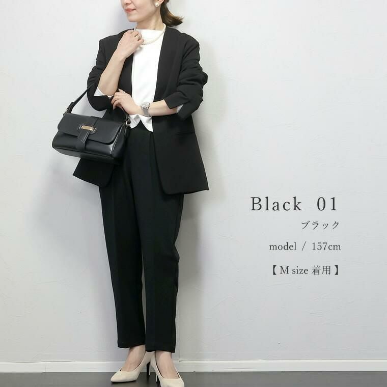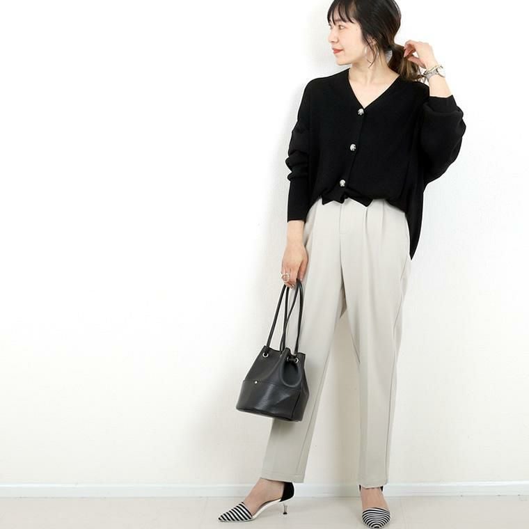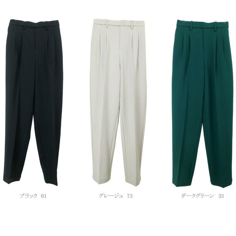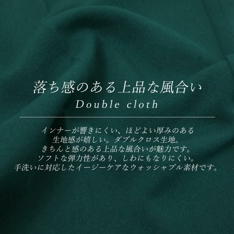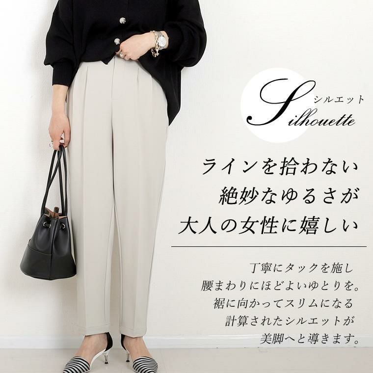 ダブルクロスタックテーパードパンツ 上品なドレープ感と穿きやすさが魅力の通年テーパードパンツ。 インナーが響きづらいほどよい厚みと、落ち感のある品の良いダブルクロス 生地を採用。ソフトな弾力性もあり、動きに合わせて生地が優しく伸縮し 着心地も快適。ウエストの後ろゴム仕様も嬉しいポイントです。 シルエットは腰まわりゆったり、裾に向かってスッとスリムになる美脚見え テーパード。体型カバーにも定評のあるシルエットで、大人の女性におすすめです。 オンオフ問わずオールシーズン着まわせ、デイリーコーデの救世主に。