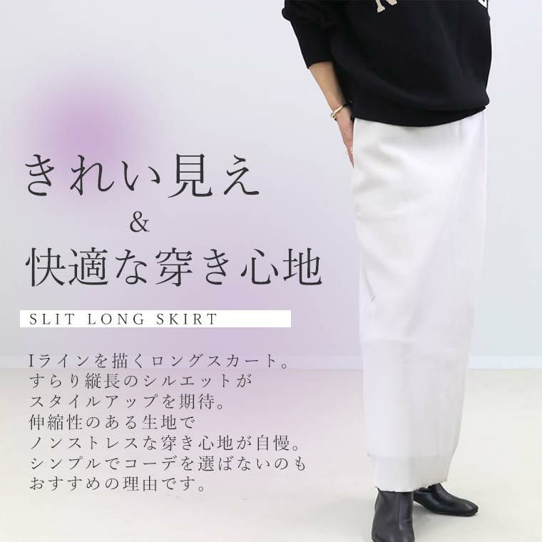 シンプルさを追求したミニマルなシルエットのロングスカート。すらりIラインを描く縦長のシルエットがスタイルアップを期待させます。伸縮性のあるポリニット素材を採用し、穿き心地ノンストレス。その上、裾にスリットをあしらうことで脚捌きも軽快です。前後どちらをメインでも着用いただける賢い2way仕様も嬉しいポイント。どんなトップスとも合わせやすく、フルに活躍すること間違いなし。