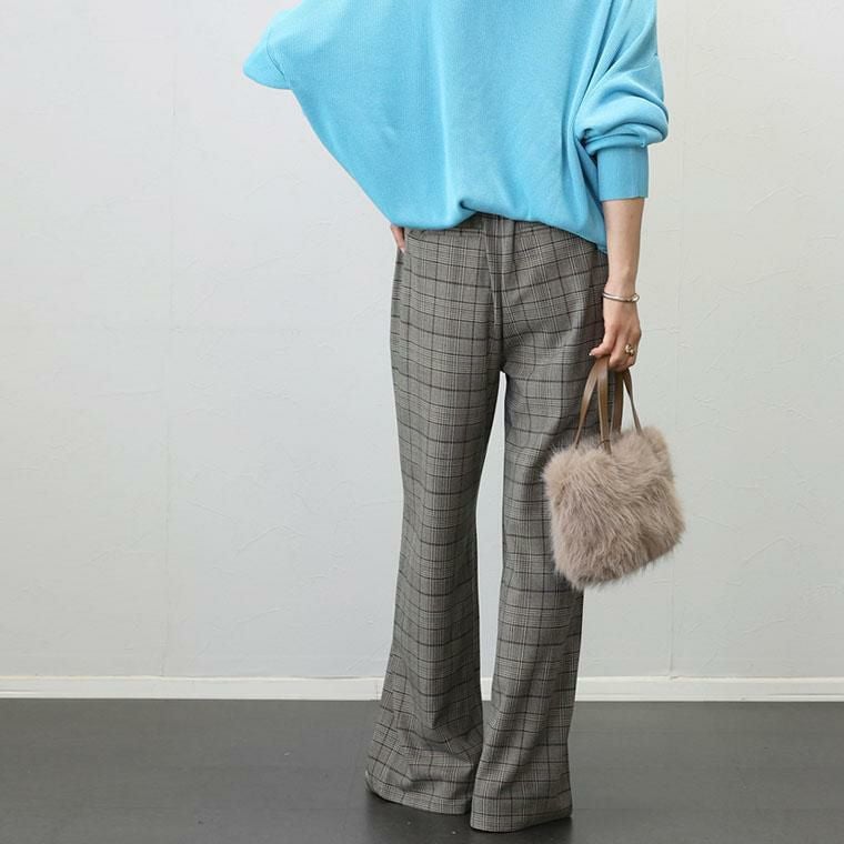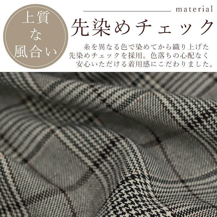 すっきりとした美脚効果が期待できるこだわりワイド、穿いた時のシルエットがとても綺麗なパンツです。糸を異なる色で先に染めてから織り上げた先染めのチェック生地を採用。きちんと感があり、上質な風合いです。色落ちの心配がないのも嬉しい。マニッシュになり過ぎないよう、生地にはレーヨンを織り込みしなやかな印象に仕立てました。ウエストはフロント脇までゴムでストレスレスな穿き心地。さっと穿けるプルオンデザインながらフェイクの前開き仕様&ベルトループ付きで、トップスをINした時もサマになるよう計算されています。コーディネートに取り入れるだけでシーズンムード高まるチェック柄パンツです。