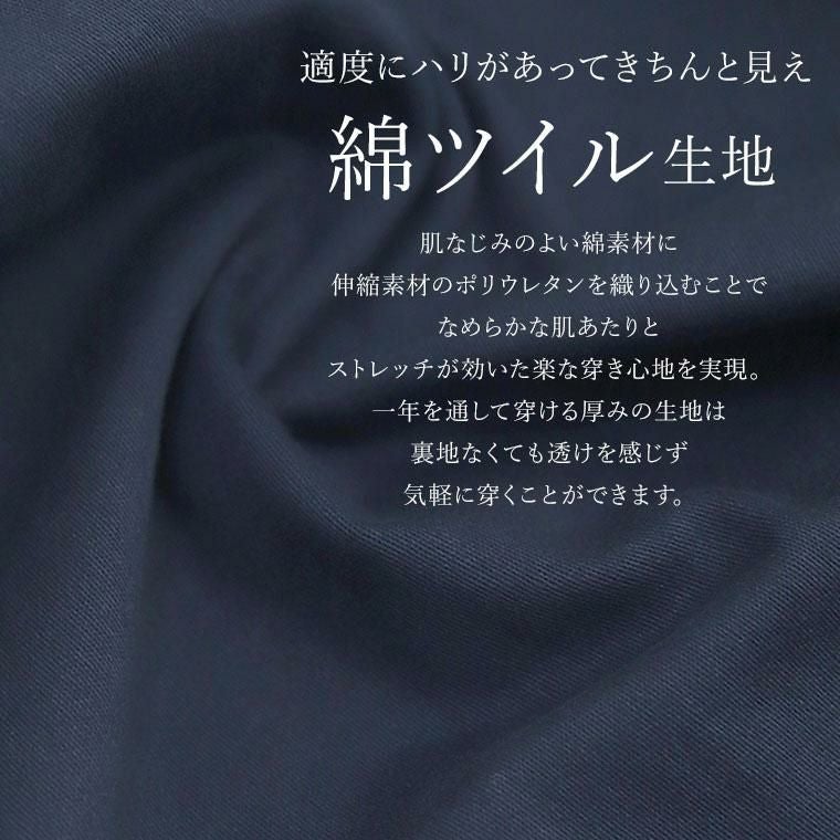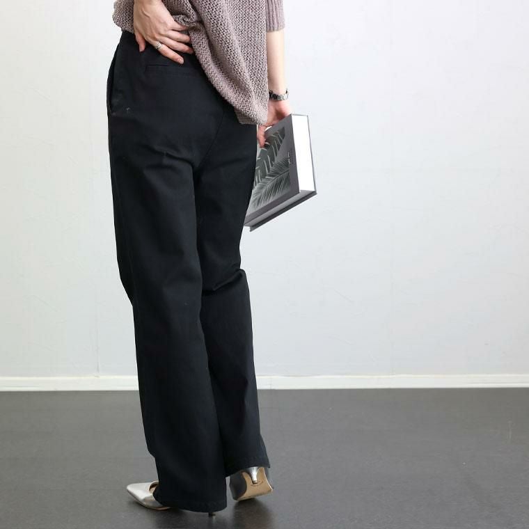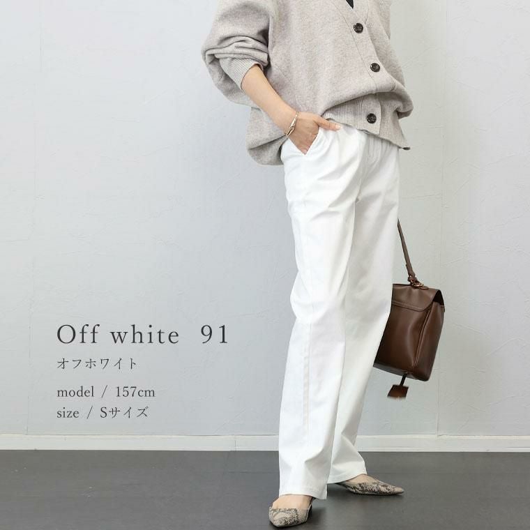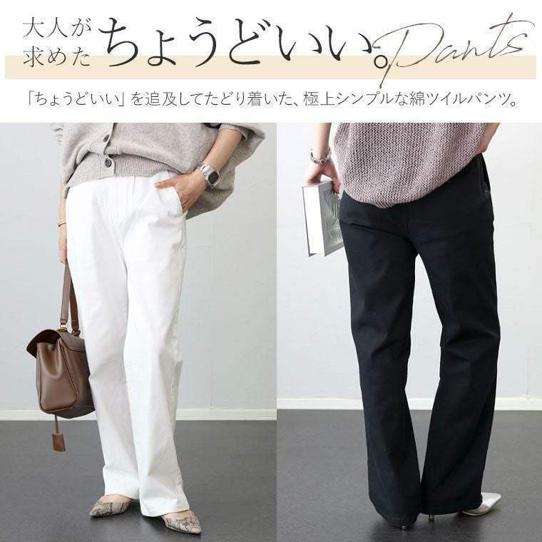 「ちょうどいい」を追求した綿ツイルパンツ。極上シンプルでありながらも、ラインの美しさと穿き心地の良さにこだわった大人の為のパンツです。生地にはほどよいハリ感でレッグラインを拾わない綿ツイルを採用。セミワイド&ストレートのシルエットですらりとした美脚ラインを描きます。伸縮素材を織り込むことで、ストレッチが効いた穿き心地の良さを実現。お腹まわりは後ろゴムやゆとりあるで設計で、窮屈さを感じず長時間穿いていても楽ちんです。テイストに左右されず大人が穿きやすいベーシックなデティールは、一年を通して幅広いコーデに活用いただけます。
