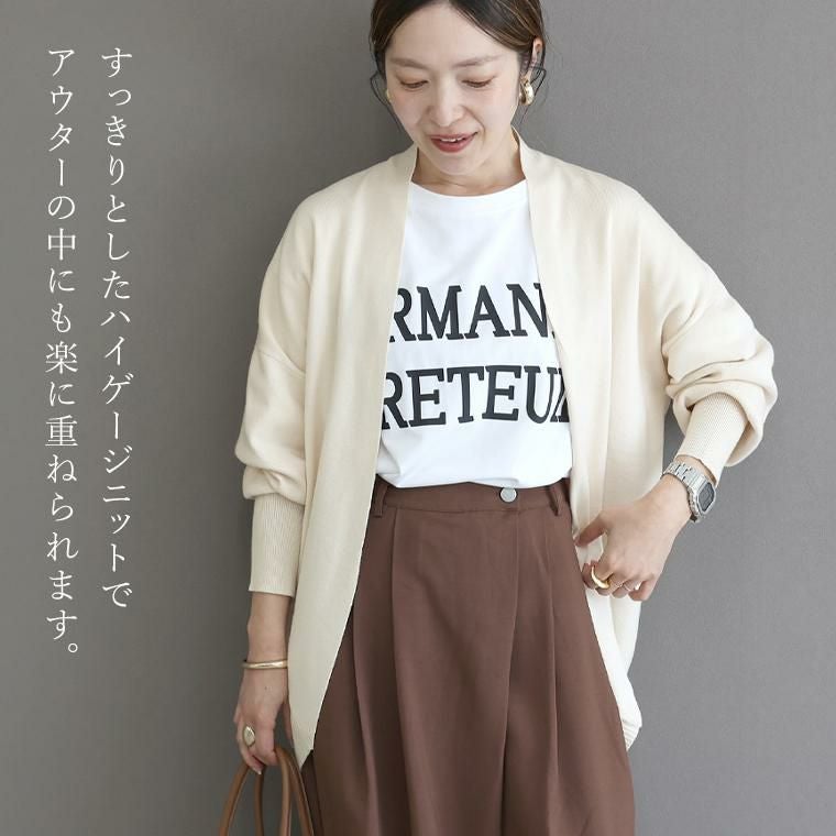 体のラインを優しく包み込む丸みシルエットが女性らしい雰囲気のドルマンカーディガン。ワイドな身幅と、ゆったりとしたドルマンスリーブに引き締め感のあるリブ袖が好バランス、華奢見せを誘います。さっと羽織ることのできるトッパーシルエットで、ボタンのあるシャツやワンピースとも相性抜群です。ほどよくストレッチする目の詰まったハイゲージニットを採用し、着心地楽&きれいめな印象に。着こなし次第で長い季節活躍してくれる一着です。