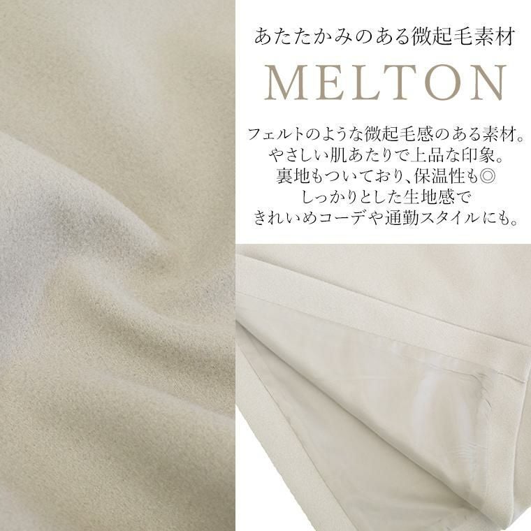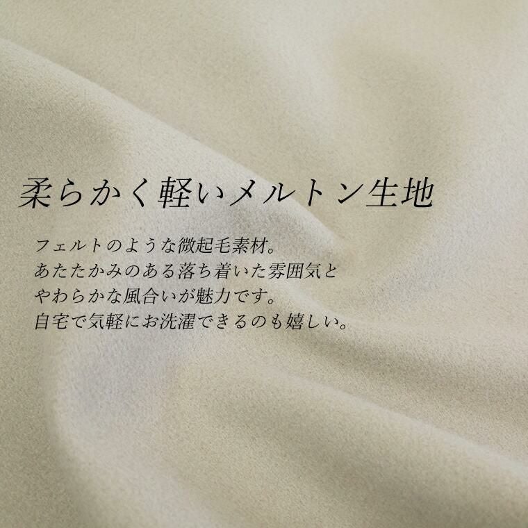 全方位、どこから見ても品よくみえるデザインにこだわった大人の女性の為のメルトンコート。スムースな高級感のある素材で通勤スタイルから休日のお出かけまで幅広いシーンに着用いただけます。ほどよい厚みで触り心地よく、裏地も付いているので袖を通した時もなめらか。顔まわりをすっきりみせるノーカラーVネックはシャープな印象に。中に合わせるトップスを選ばず、マフラーやストールなどの冬小物も合わせやすい。ご自宅で洗濯ができるのも魅力のひとつです。きれい見えするのにイージーケア、この冬の主力アイテムになること間違いなし。