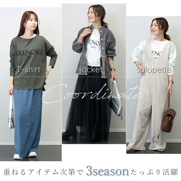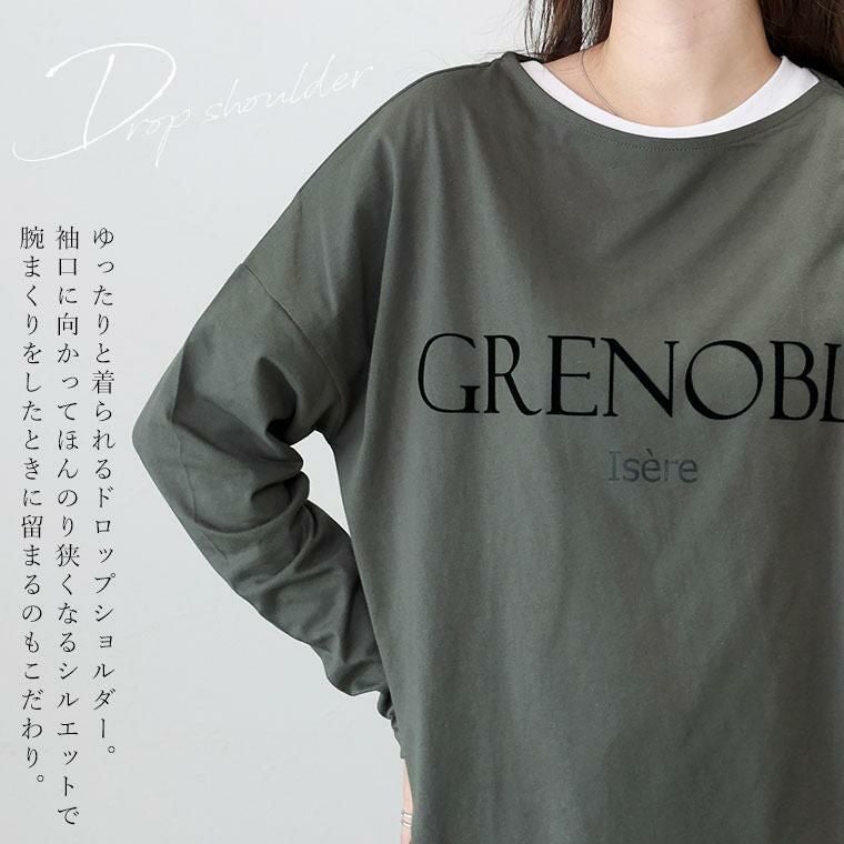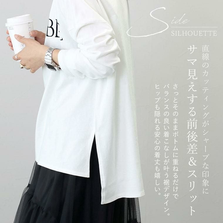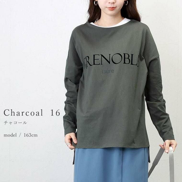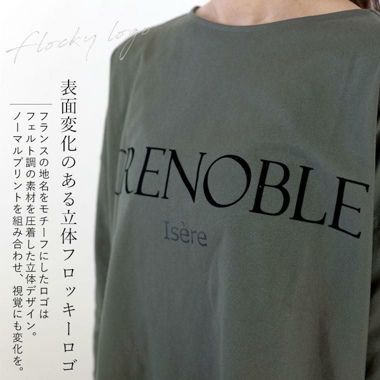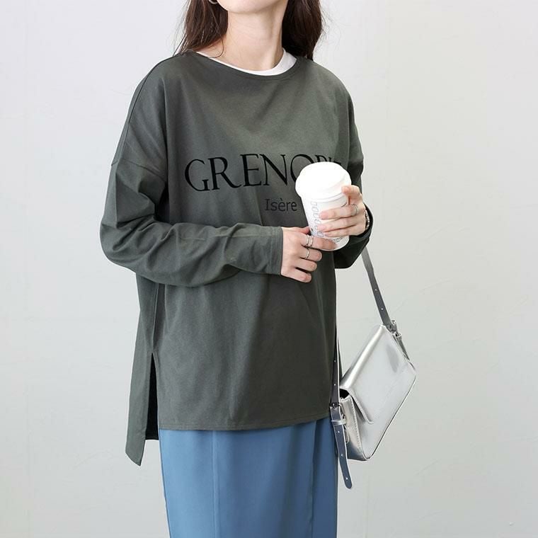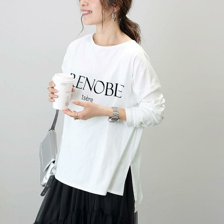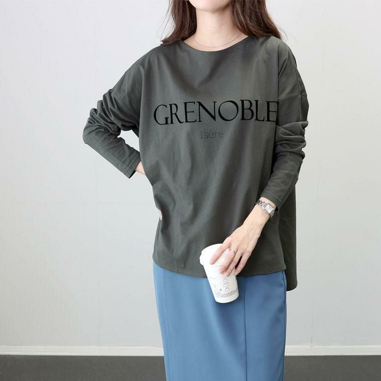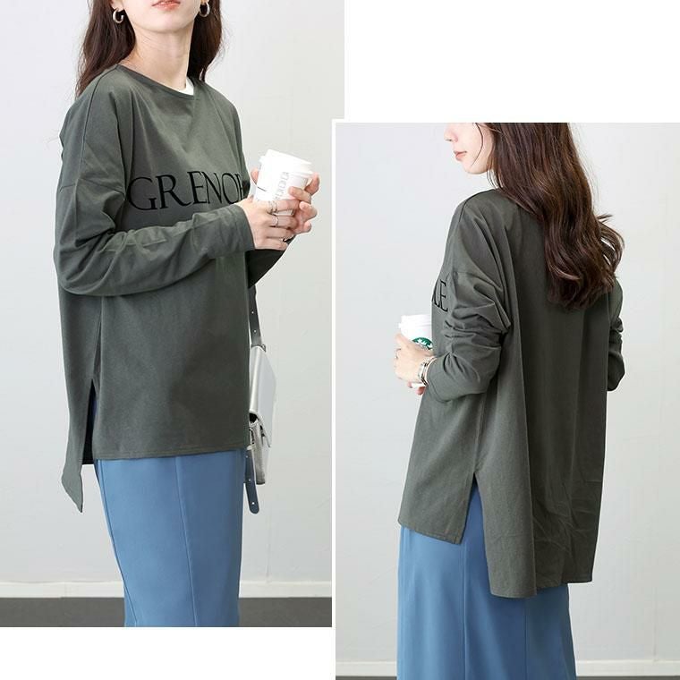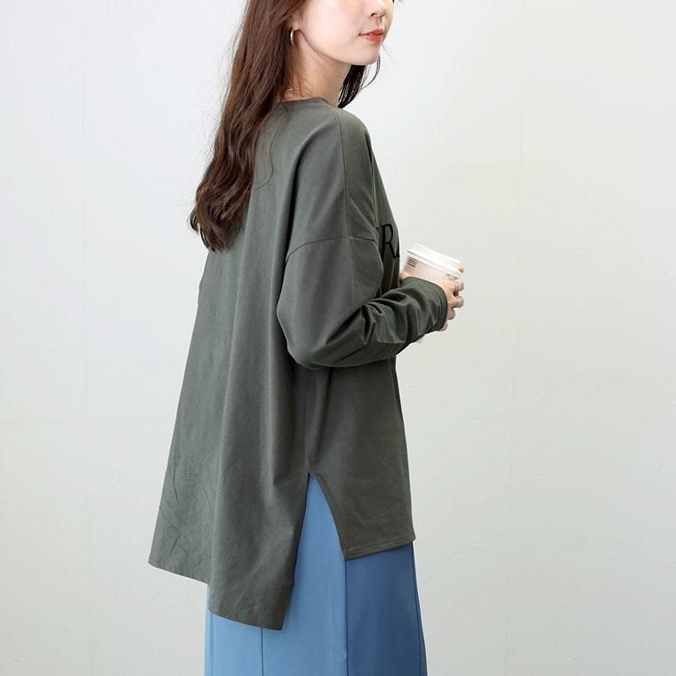 大人の女性の為に計算尽くしたフロッキーロゴのロンT。シルエットはもちろん、素材から文字のデザイン、カラーリングまでひとつひとつのディテールにこだわって作られたオリジナルアイテムです。フェルト調の素材を圧着した立体フロッキーと、ノーマルなロゴを組み合わせ表面変化のあるデザインに。一枚着としてはもちろん、羽織りのインや旬の深Vベストやサロペットのインナーとしてもバランス良くキマルロゴ設定が自慢です。素材は素肌にも安心な綿100%。程よいゆったり感で体のラインを拾いづらく、ドロップショルダーはトレンド感ある印象に。3シーズンたっぷり着まわせる万能アイテムです。