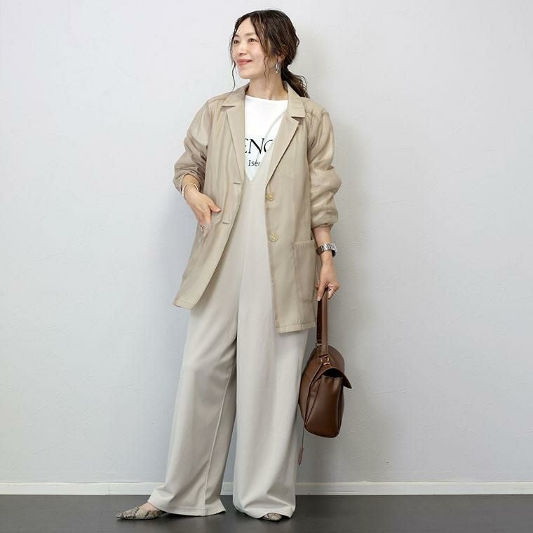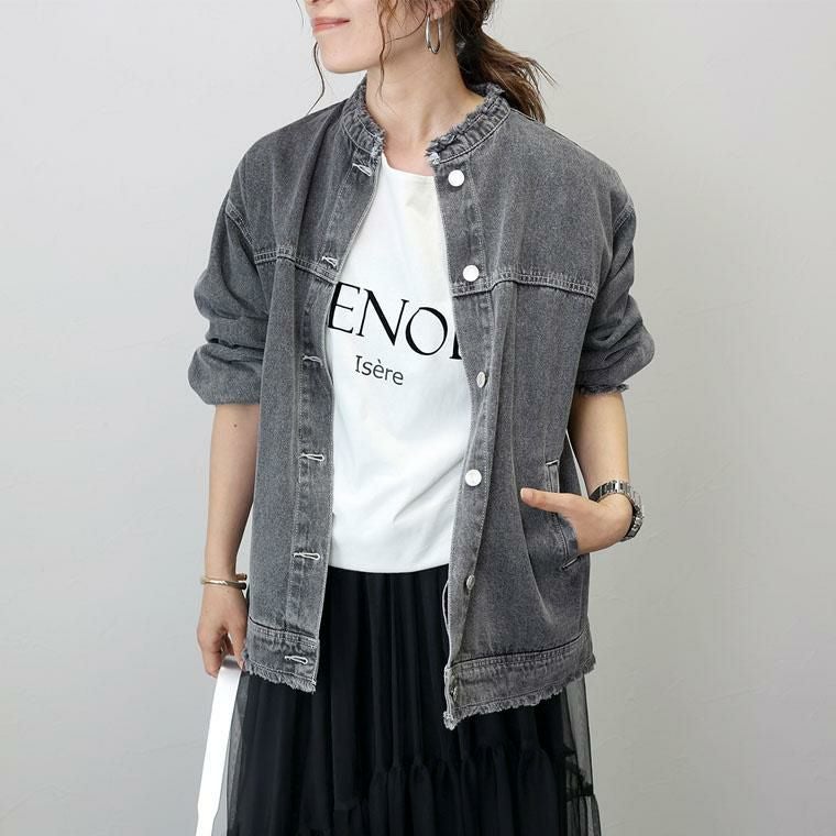 着丈はヒップから5cm下。袖丈は手首から13cm下。程よくゆとりがありますが、袖は袖口に向かって細くなっているので腕まくりをすると止ります。長めの着丈でヒップを隠してくれます。襟は広めですがインナーが丁度出ないので気になりません。