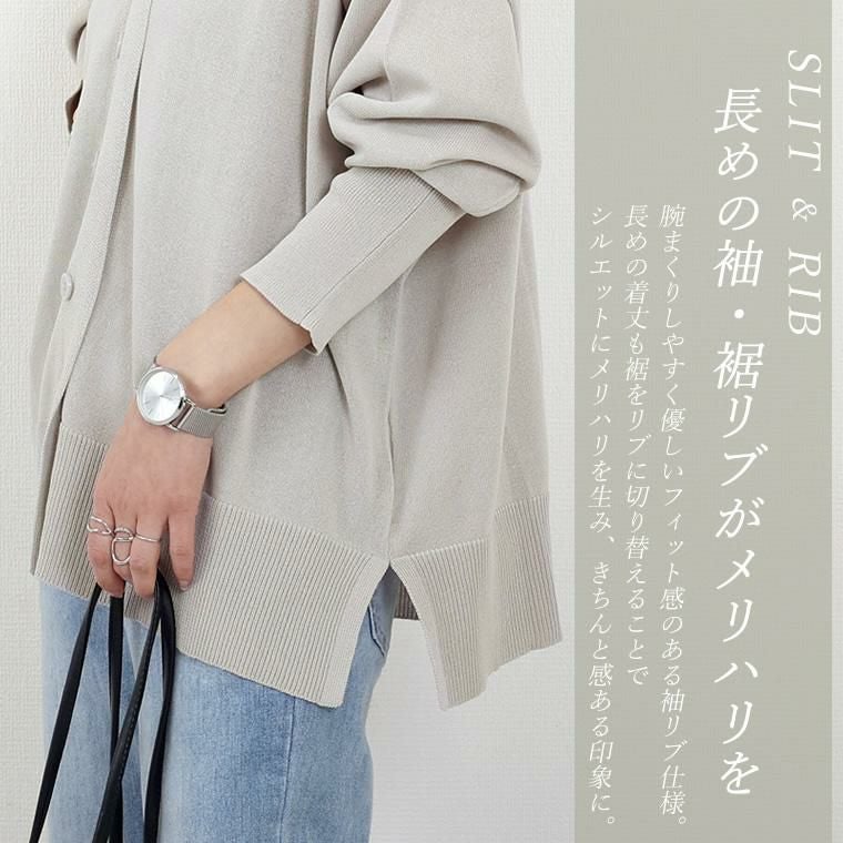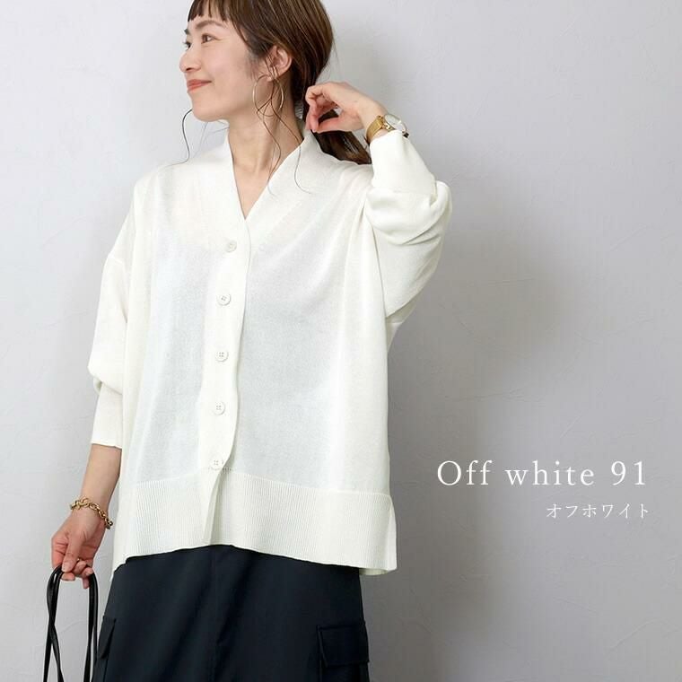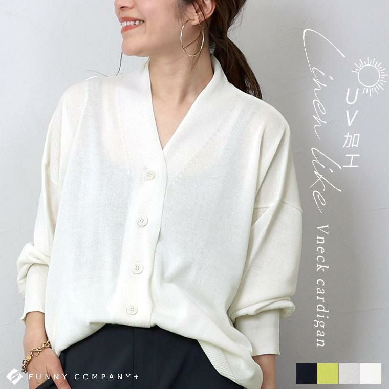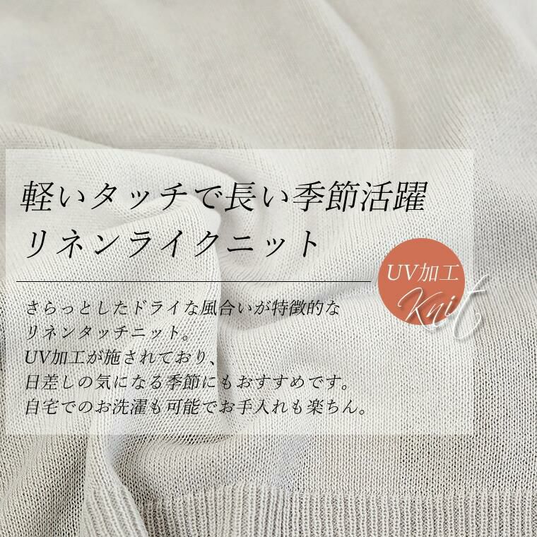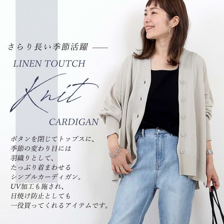 UV加工 リネンライクVネックカーディガン ボタンを閉じればトップスとしても着用可能な2way仕様の ニットカーディガン。素材にはさらりとした薄手のリネンタッチニットを採用。 UV加工が施されており、日差しが気になる季節の羽織りとしても重宝します。 襟元はすっきり着られる深すぎないVネックに設定。プルオーバー として着用した時も程よい開きなのでインナーにも悩みません。抜け感のある オーバーシルエットも魅力。体が泳ぐような、たっぷりなゆとりがありながらも 長めにとったリブ袖やサイドのスリット、裾のリブがアクセントとなり メリハリのあるシルエットを描いてくれます。ベーシックなカラーに差し色を 加えた旬なカラー展開で、色違いで揃えたくなる一着です。