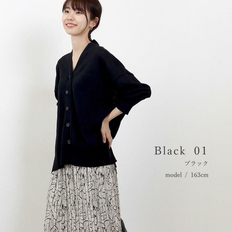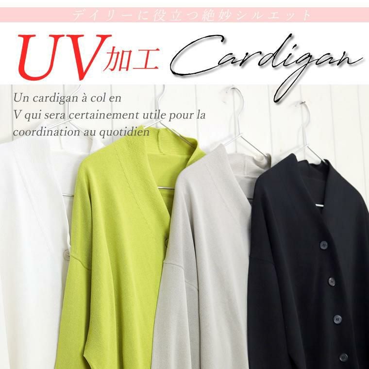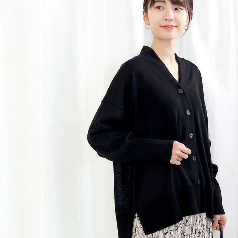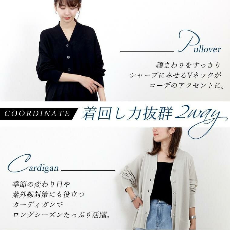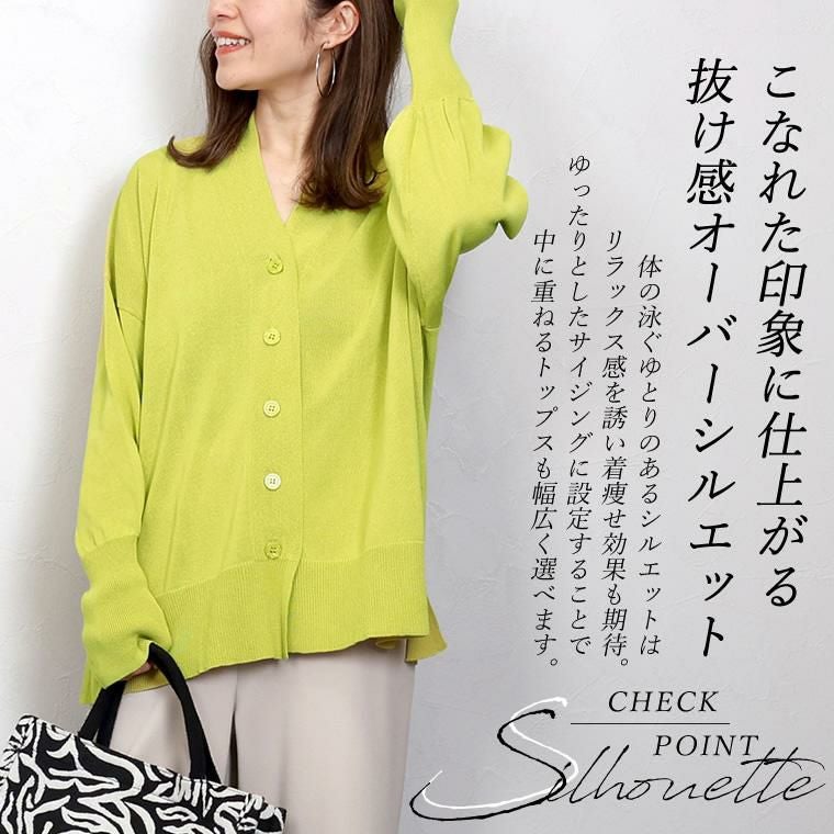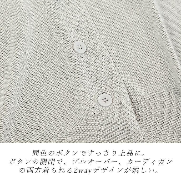 UV加工 リネンライクVネックカーディガン ボタンを閉じればトップスとしても着用可能な2way仕様の ニットカーディガン。素材にはさらりとした薄手のリネンタッチニットを採用。 UV加工が施されており、日差しが気になる季節の羽織りとしても重宝します。 襟元はすっきり着られる深すぎないVネックに設定。プルオーバー として着用した時も程よい開きなのでインナーにも悩みません。抜け感のある オーバーシルエットも魅力。体が泳ぐような、たっぷりなゆとりがありながらも 長めにとったリブ袖やサイドのスリット、裾のリブがアクセントとなり メリハリのあるシルエットを描いてくれます。ベーシックなカラーに差し色を 加えた旬なカラー展開で、色違いで揃えたくなる一着です。