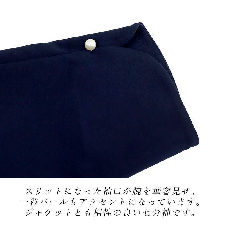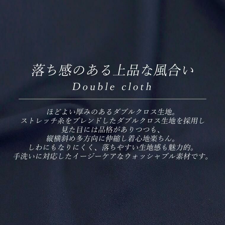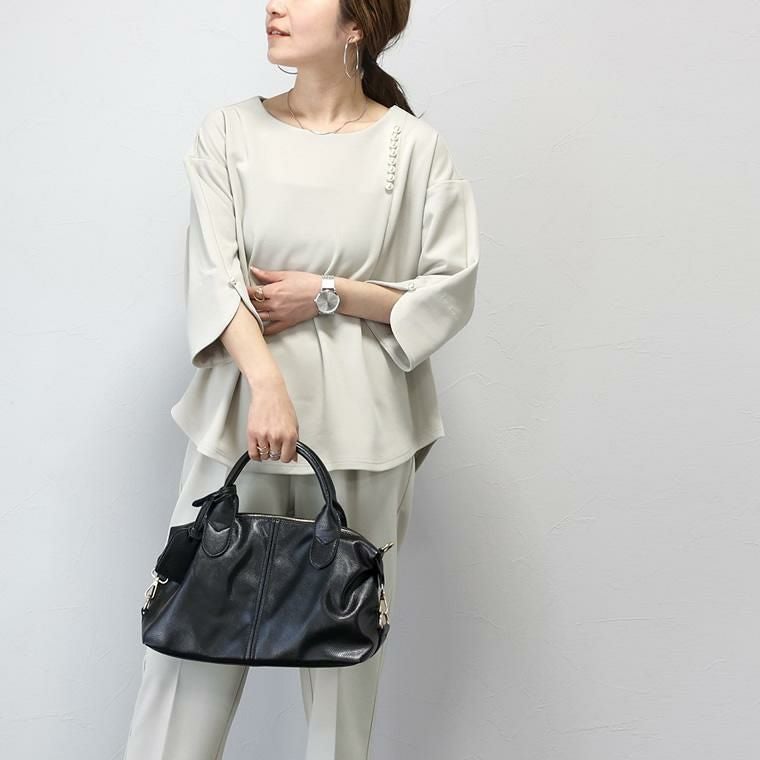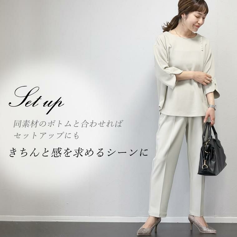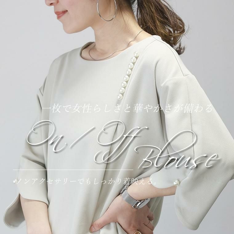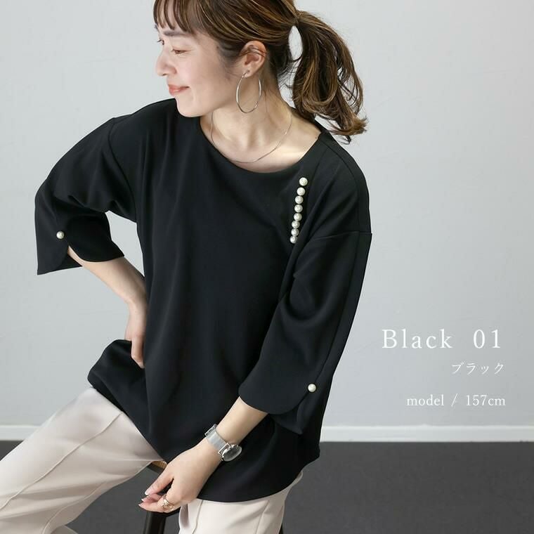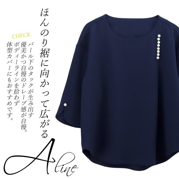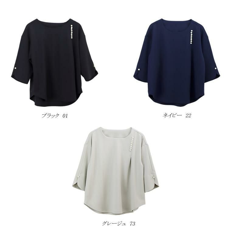 ダブルクロスパールモチーフ7分袖ブラウス 一枚で女性らしさと華やかさが備わるオンオフ両用ブラウス。 アシンメトリーに並んだ襟元のパールが上品で、顔まわりをぱっと 明るく華やぎます。アクセサリーいらずのデザインで、普段使いから きちんと感を求めるシーンにもおすすめです。裾に向かってやや広がるAライン シルエットと、パール下のタックが優美なドレープを描きボディーラインを カバーしてくれる効果も。しわになりづらいダブルクロス生地を採用し お手入れも楽々。ジャケットと相性の良い7分袖で長い季節活躍してくれます。
