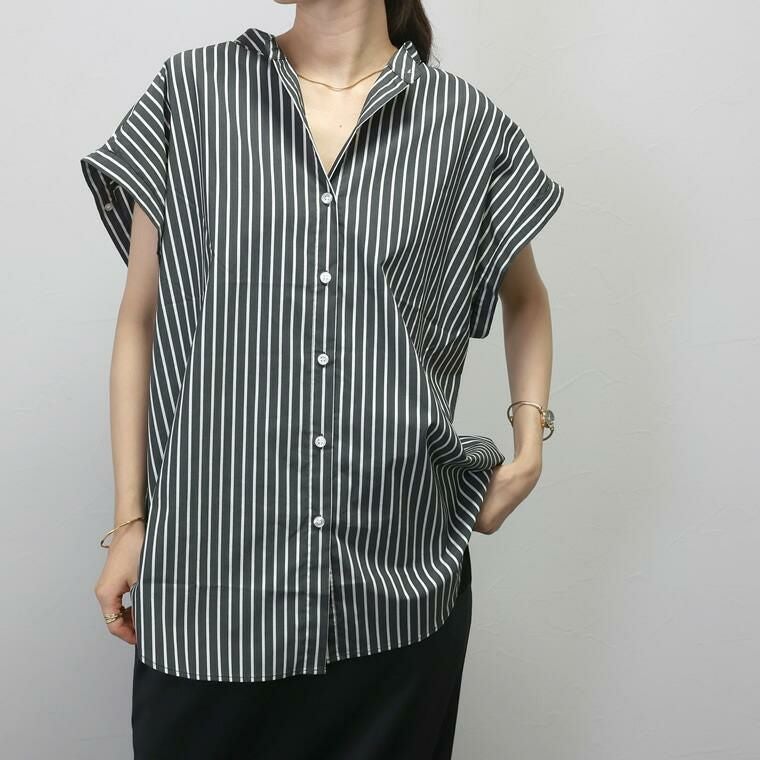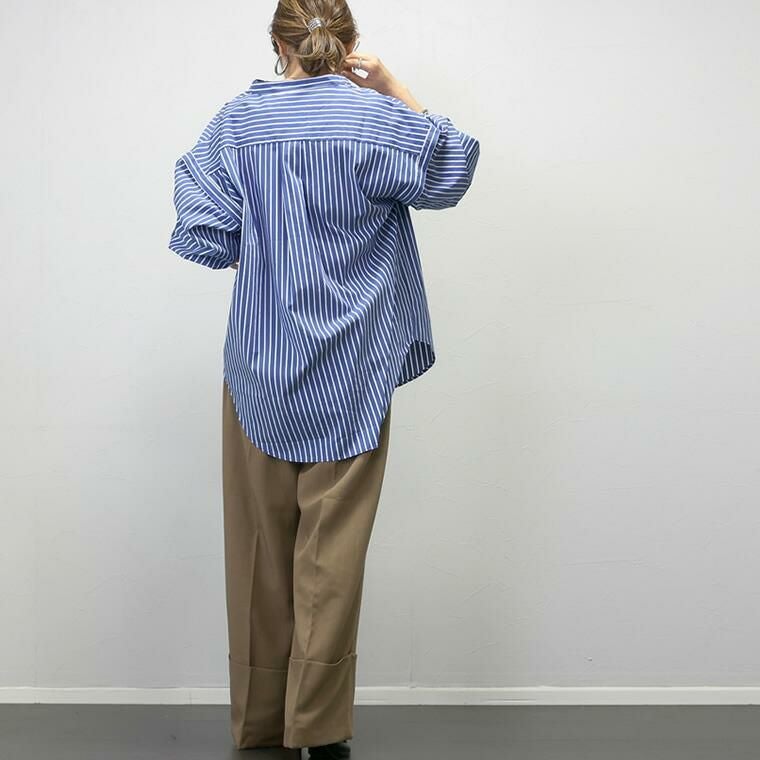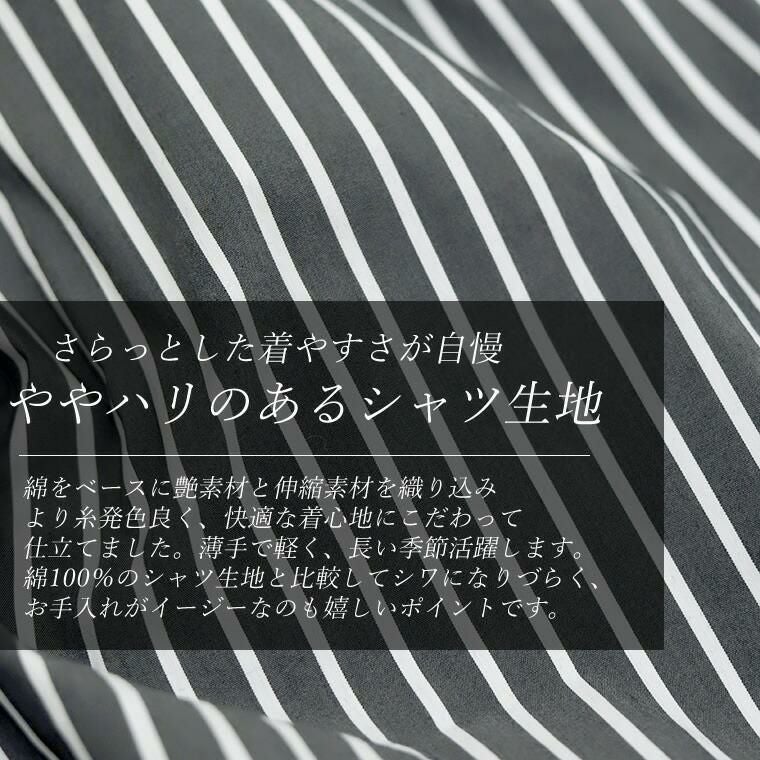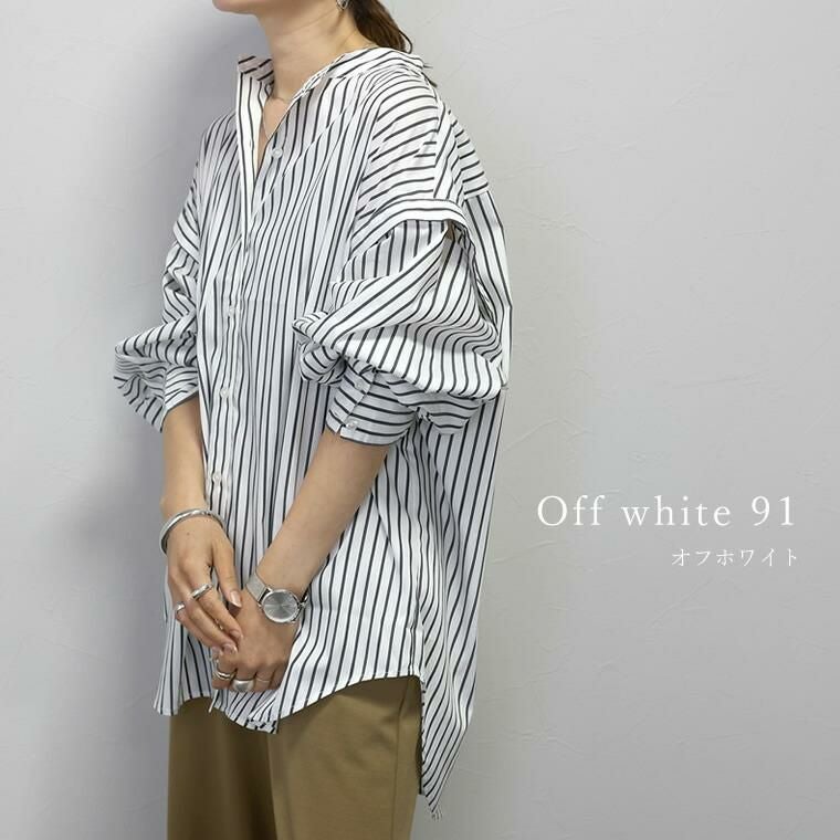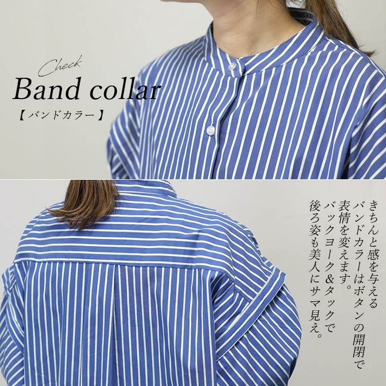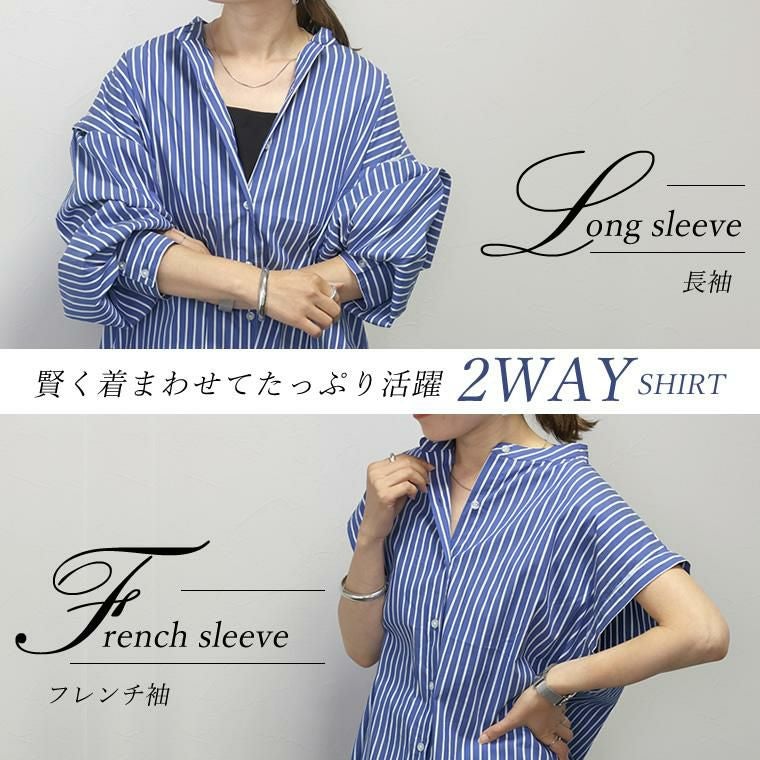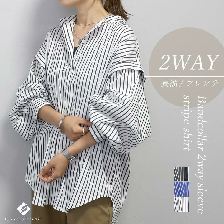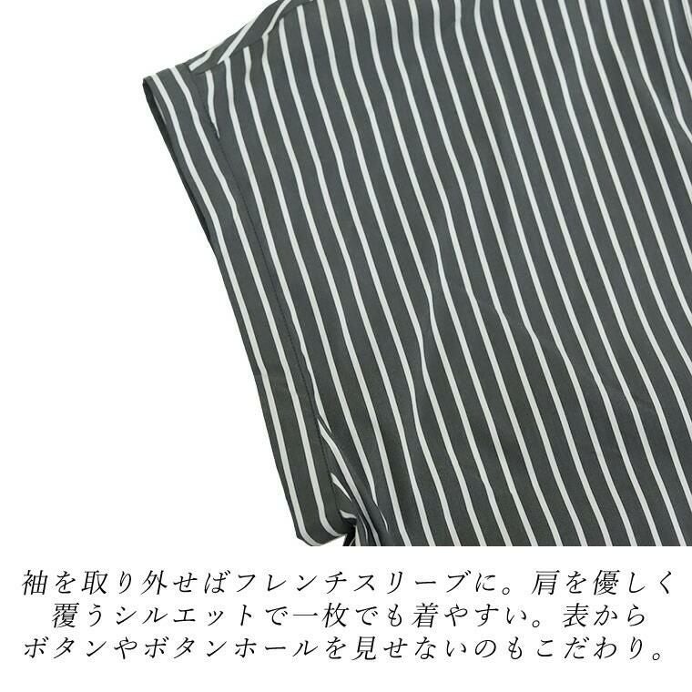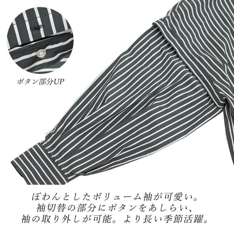 バンドカラー2wayスリーブストライプシャツ コーディネートに爽やかに着映えるストライプシャツ。 一見シンプルなストライプシャツながらも、袖の取り外しが可能な2way仕様が 特徴。長袖とフレンチ袖の2パターンが一着で手に入る賢いデザインです。 春や秋は長袖シャツや羽織りとして、夏はフレンチシャツとして、 冬はニット等のインにも使え、オールシーズン活躍してくれる優れもの。 さらっとした軽い着心地にほどよいハリがあり、着るだけで自然な立体感が生まれ ボディーラインも拾いません。綿100%の布帛生地と比べ、しわになりづらいのも嬉しい。 機能性はもちろん、ボリューム袖のシルエットも可愛いおすすめシャツです。