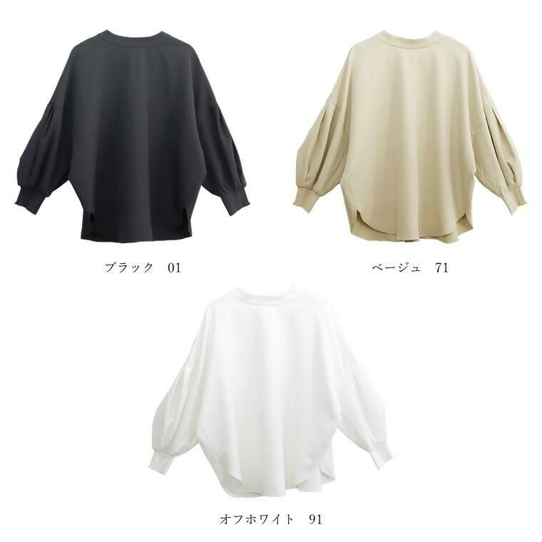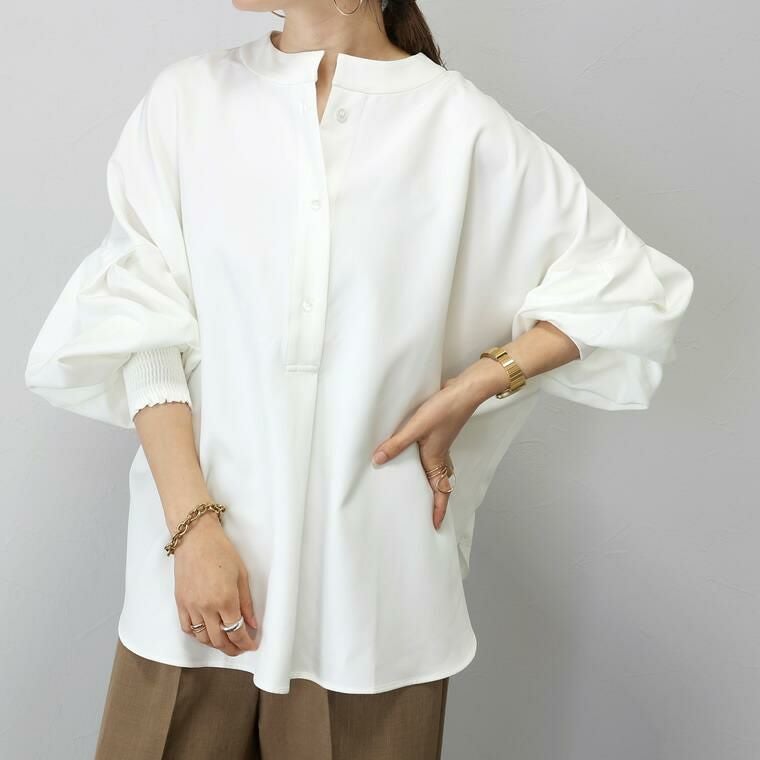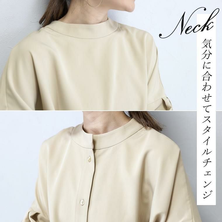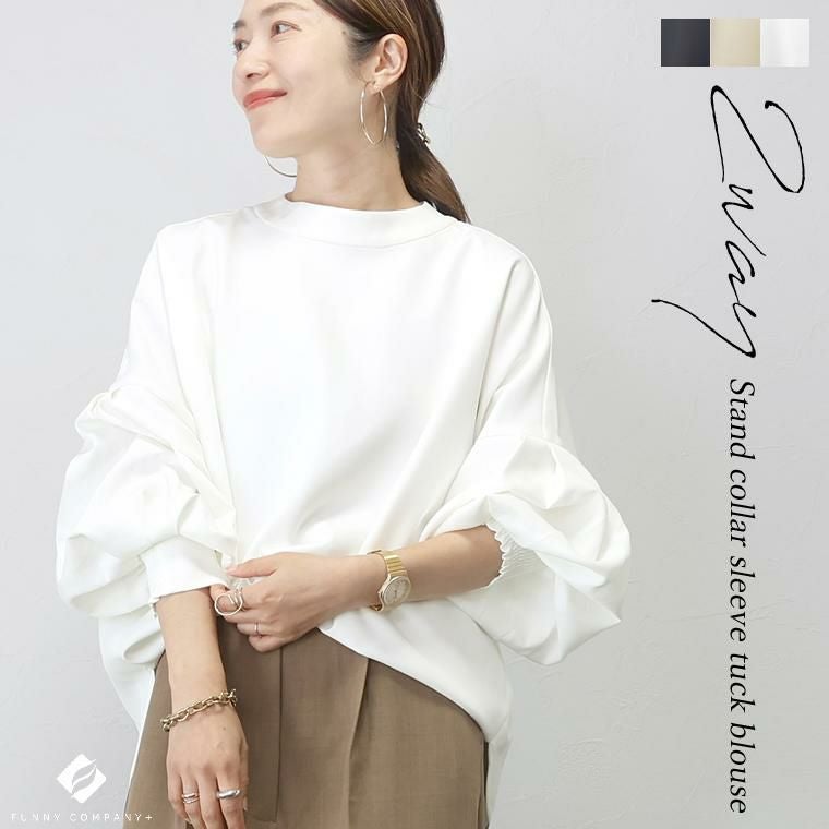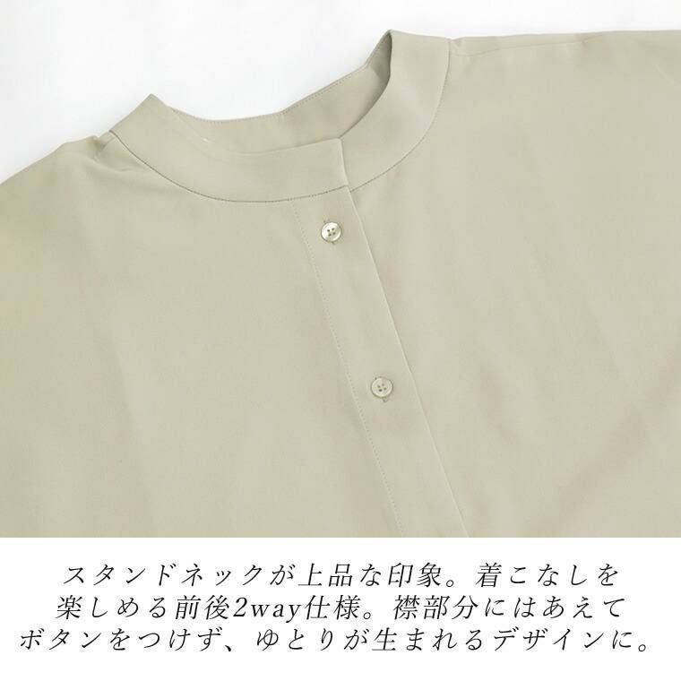 スタンドカラー袖タック2wayブラウス タック&シャーリングをあしらった人気の袖デザインブラウス。 ぽわんとした袖のボリュームシルエットが今年らしく、抜群に華やぎます。 袖口のシャーリングゴムで腕まくりも楽々。見た目の可愛さはもちろん、 日常動作もノンストレスに。前後どちらをメインにしても着られる2way仕様も嬉しい。 前ボタン後ボタンどちらも楽しむことができ、さらにボタンを開けてインにタートルを 重ねれば長い季節活躍します。生地はカジュアルにもきれいめにも対応する 艶感のあるエステルスパンを採用。伸縮素材ポリウレタンを織り込み 着心地の良さにもこだわりました。1着で2着分活躍する賢いブラウスです。
