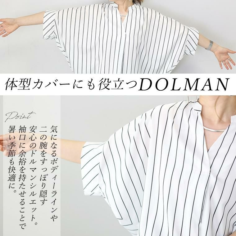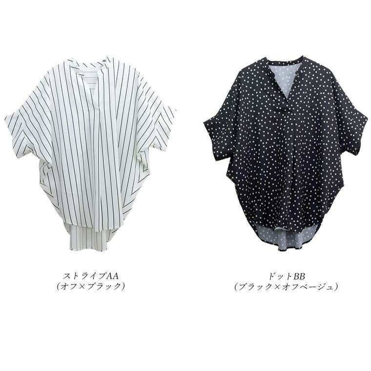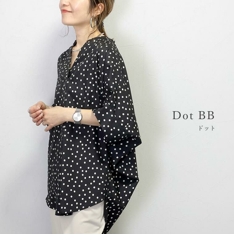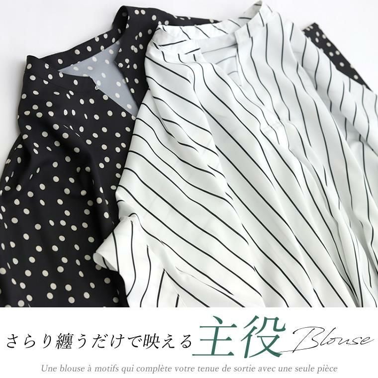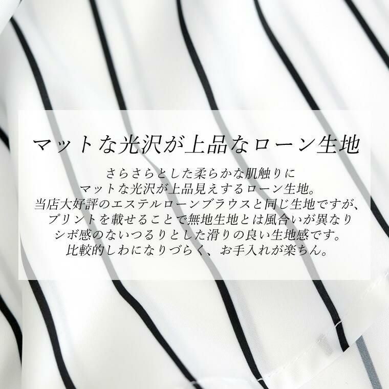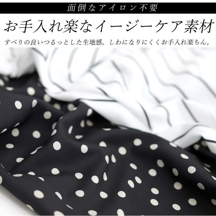 アソートプリントスキッパードルマンブラウス 当店大人気、エステルローンスキッパードルマンブラウスの 着映える柄タイプの登場です。ストライプとドットの2種類で、華やかながらも シックな色使いなので取り入れやすく、幅広いシーンにご着用いただけます。 縦のラインを強調し着痩せ見えするストライプ柄は、中でも華奢なペンシル ストライプを採用し、知的で清楚な女性らしさを印象付ける。 程よい甘さが魅力の ランダムドットは大人の女性にマッチ。どちらもベーシックなカラーで上品な表情を みせます。ボディーラインを拾わないドルマンや顔まわりをすっきり見せるスキッパー襟など 人気のシルエットはもちろんそのまま。比較的しわになりづらいポリエステル素材で お手入れ楽々。通勤からお出掛けまでデイリーに大活躍する一着です。 人気NO1!同シルエットの無地バージョンはこちら