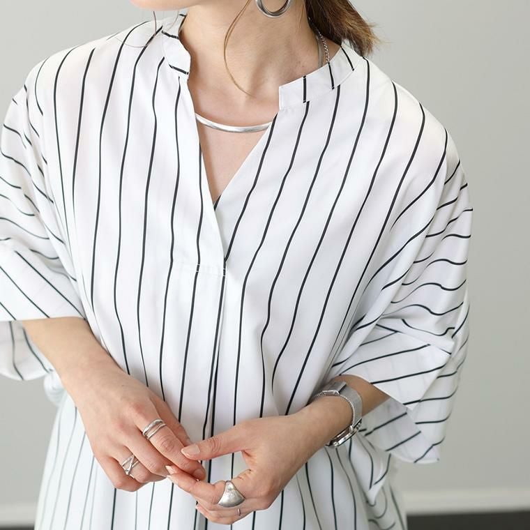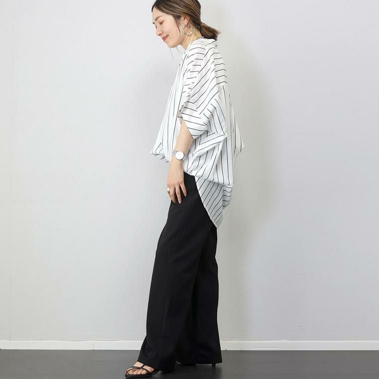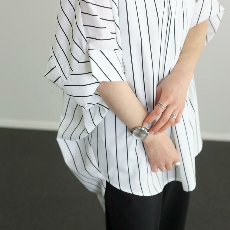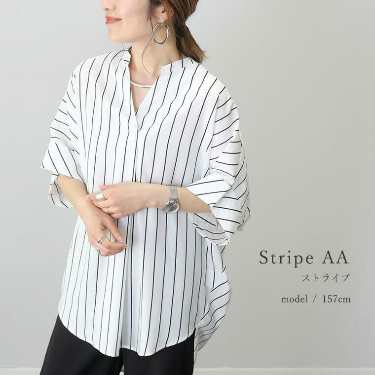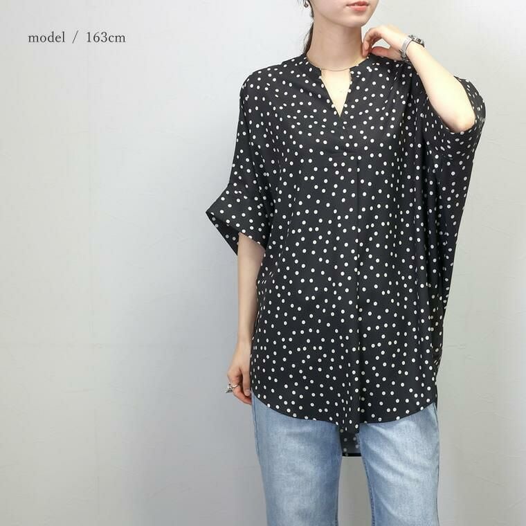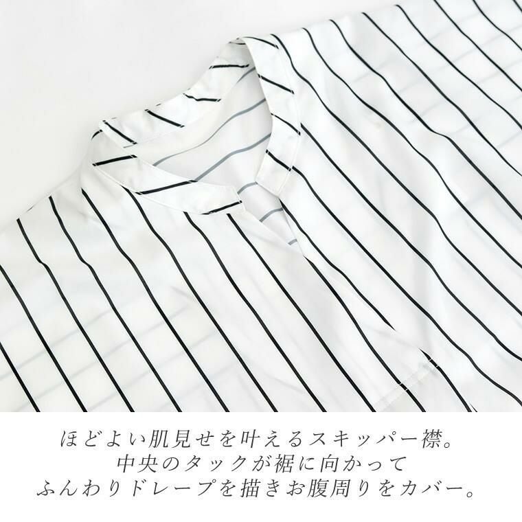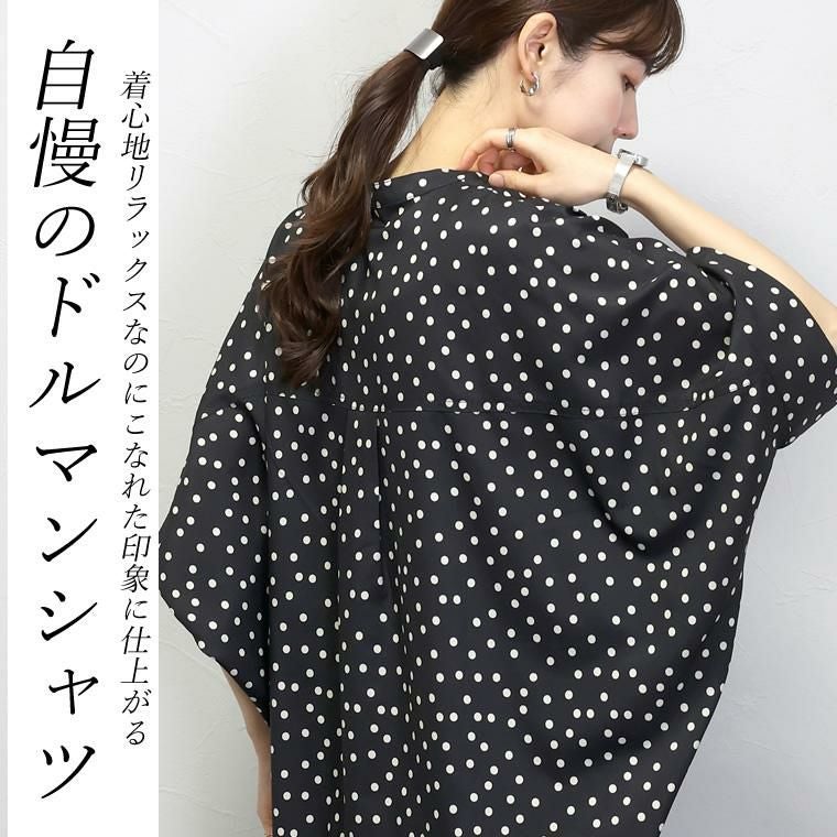 アソートプリントスキッパードルマンブラウス 当店大人気、エステルローンスキッパードルマンブラウスの 着映える柄タイプの登場です。ストライプとドットの2種類で、華やかながらも シックな色使いなので取り入れやすく、幅広いシーンにご着用いただけます。 縦のラインを強調し着痩せ見えするストライプ柄は、中でも華奢なペンシル ストライプを採用し、知的で清楚な女性らしさを印象付ける。 程よい甘さが魅力の ランダムドットは大人の女性にマッチ。どちらもベーシックなカラーで上品な表情を みせます。ボディーラインを拾わないドルマンや顔まわりをすっきり見せるスキッパー襟など 人気のシルエットはもちろんそのまま。比較的しわになりづらいポリエステル素材で お手入れ楽々。通勤からお出掛けまでデイリーに大活躍する一着です。 人気NO1!同シルエットの無地バージョンはこちら
