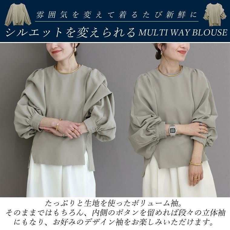 ディテールに女性らしさを散りばめたこだわりのデザインブラウス。そのまま着るだけで可愛い旬のボリューム袖は、自由に雰囲気を変えられるデザイン性が魅力。袖内側のボタンをとめることで段々な立体袖にスタイルチェンジ。モードな印象で、サロペットやベストのインとも相性抜群です。袖口はシャーリングになっており腕まくりだけでも気軽にボリュームアップ。日常動作の妨げにならず女性に嬉しいポイントです。素材はきれいめコーデにも合わせやすいマットな生地感。比較的しわになりづらくお手入れも楽々。オンにもオフにも役立つ、一枚で何着分も役立つマルチウェイブラウスです。