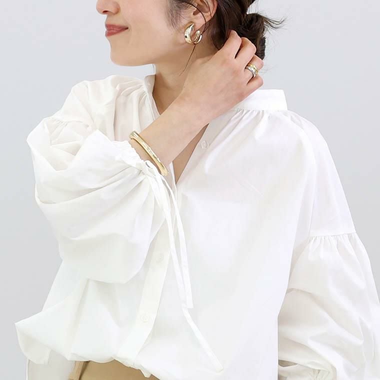 纏うだけでふわりと華やぐような、女性らしさと上品さにこだわったブラウス。ほどよくハリのあるブロードが、シルエットを美しく保ちきちんと感を演出します。ぽわんとした立体ボリューム袖が目を惹くデザイン。袖口のドロストでシルエットの調節ができ、細い共布リボンはほどよい甘さを加えます。ラグランと切替位置にこだわったドロップショルダーは肩回りを華奢にみせ体型カバーの効果も。袖付け根や襟元の丁寧なギャザー使いが柔らかさと女性らしさを演出し、高見えを誘います。上品なディテールが詰まった、大人の為の華やぎブラウス。さらりと着るだけで洗練された女性らしさが香る一枚です。