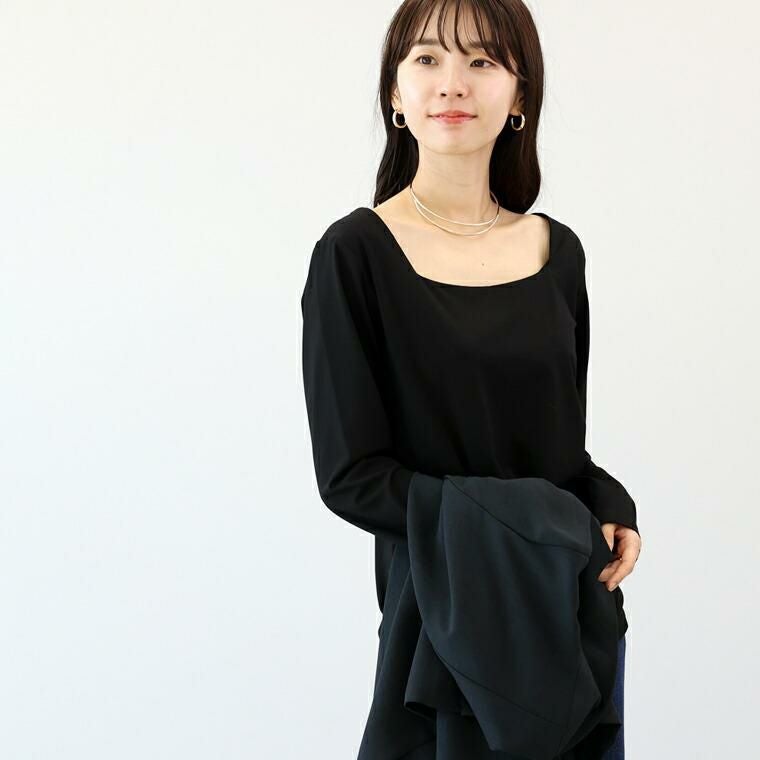 袖丈は手首から14cm下。着丈はヒップが隠れるくらい。スクエアネック側は2枚重ねになっていて透け感は気になりません(ブラック着用)。滑らかな生地で肌あたりが良いです。襟元はしっかりと開いています。