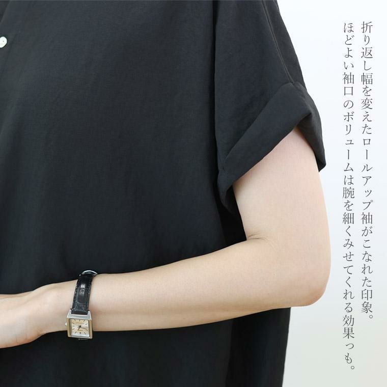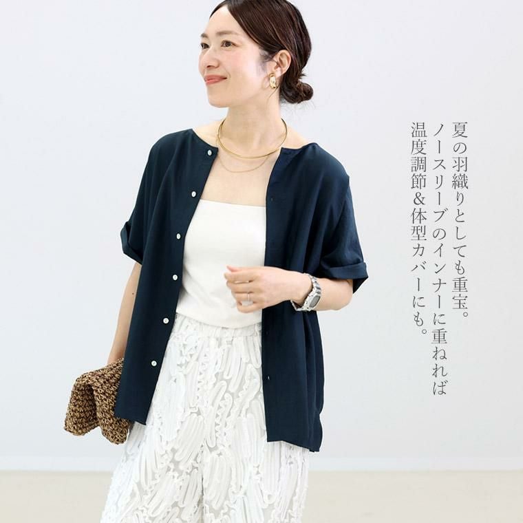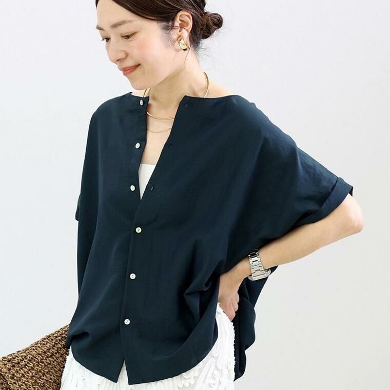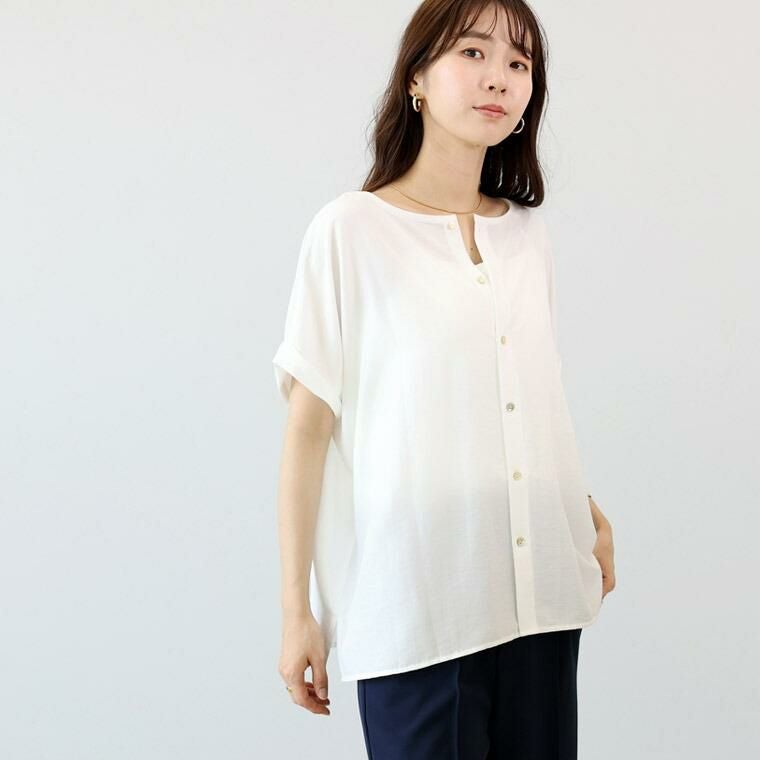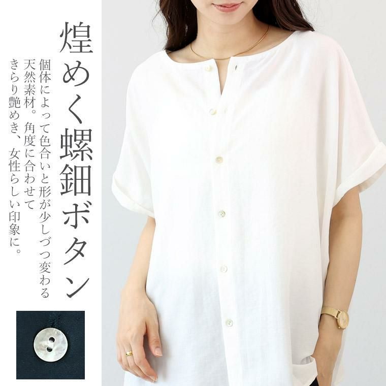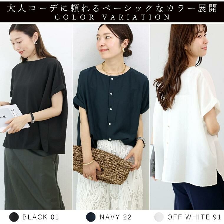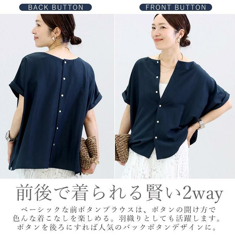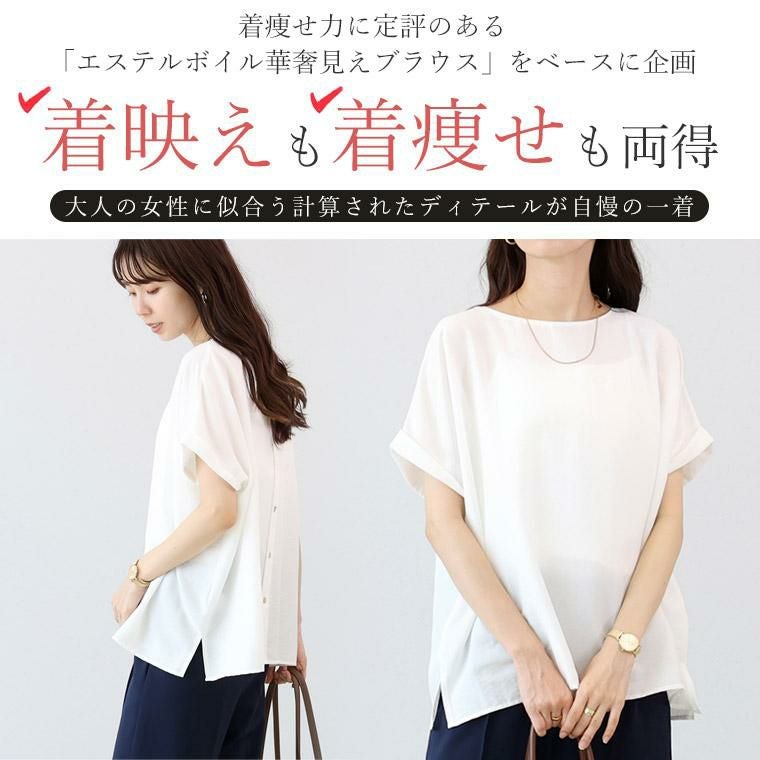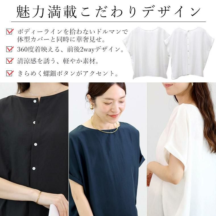 着痩せ力に定評のある「エステルボイル華奢見えブラウス」をベースに企画。後ろボタンで360度着映え、しかも前後2wayで着用可能な着回し力の高いブラウス。生地にはシボ感のある薄手で軽やかなエステルボイルを採用。ほどよい光沢がきれい見えし、きれいめなスタイリングにも。生地のシボ感でシワも目立ちにくく、お洗濯後そのままさっと着られるのも嬉しい魅力です。きらめく螺鈿ボタンがアクセント。ボタンを前にして開け方を変えれば、雰囲気の違いを楽しめます。ゆったりとしたドルマンシルエットでリラックス、体型カバーにも一役買ってくれます。着映えも着痩せも欲しい、大人の女性が頼れる夏ブラウスです。