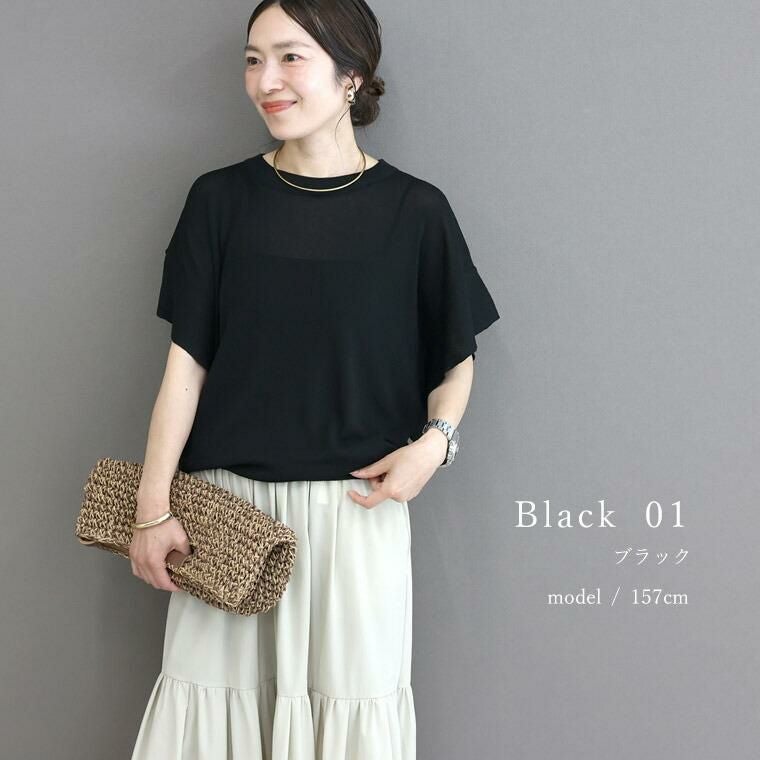 着丈はヒップが少し出るくらい。袖丈は肘から7cm上。程よく透け感があり見ためも着心地も涼しいです。袖は軽いフレアシルエットで二の腕をカバーしてくれます。少しチクチク感じたので肌の弱い方は注意です。