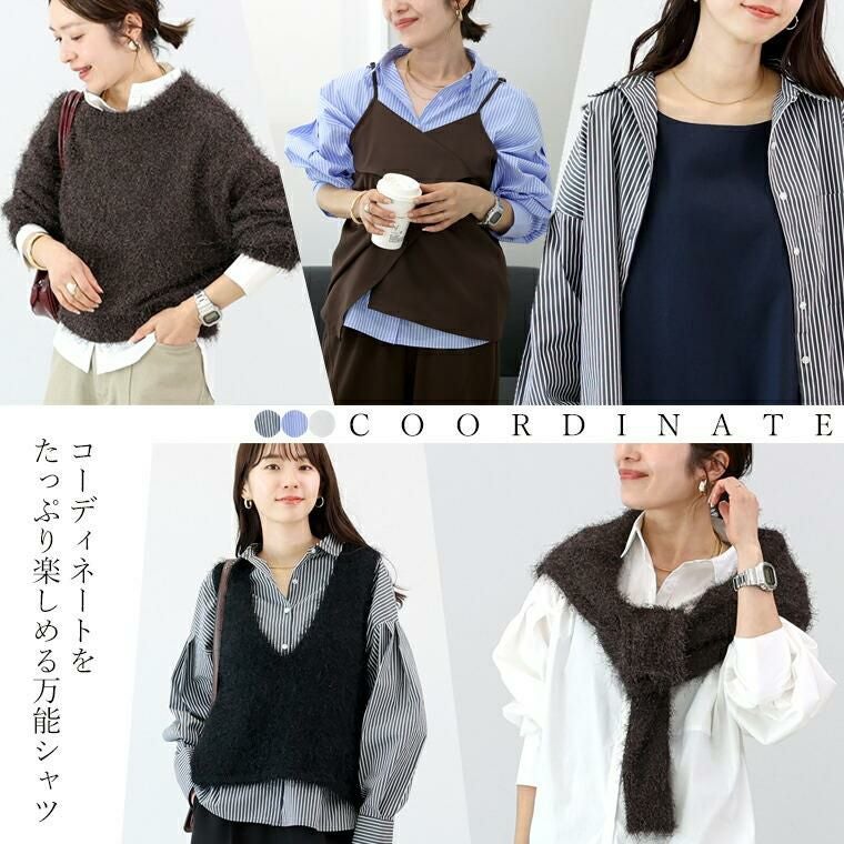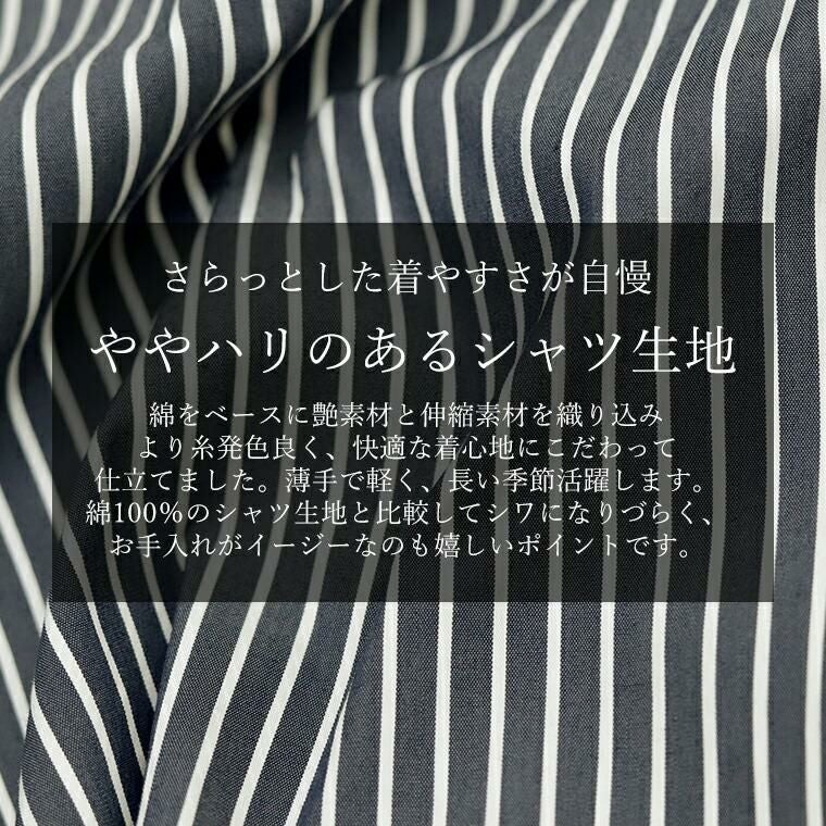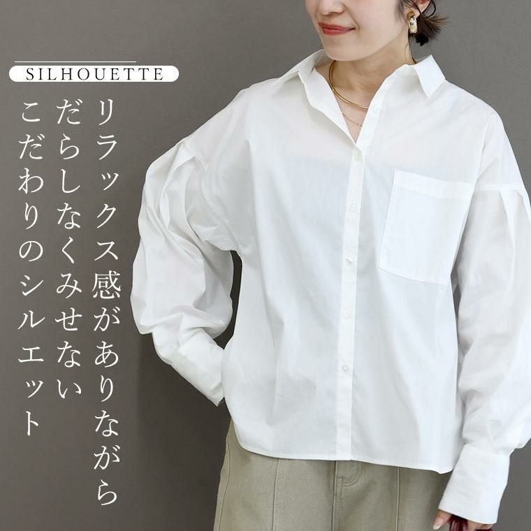 程よいハリ感と艶のあるブロード素材で仕立てた上品シャツ。綿100%の布帛生地と比べシワになりづらく、扱いやすい生地感。ベーシックな無地と爽やかなストライプのカラー展開で、一枚ではもちろん、ニットやベストのINにも活躍。オールシーズン着まわせる万能アイテムです。肩と袖口の切替にはタックをあしらい自然な立体感をプラス。ぽわんとした袖のシルエットが可愛く、凛としたシャツスタイルに女性らしい印象を与えます。ヒップラインをカバーする長めの後ろ丈で着心地安心。トレンド感とリラックス感をバランスよく取り入れた好印象抜群の長袖シャツです。