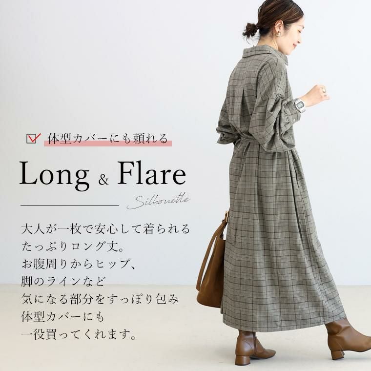 ワンピース フレア フレアワンピース ワンピ Aライン シャツ シャツワンピース シャツワンピ 襟 ベルト 共布 ロング丈 ロング チェック 先染め キレイ見え きれいめ キレイめ 綺麗め 上品 楽ちん イージー イージー素材 羽織り 前開き 長袖 ボリューム袖 ぽわん袖 チャコール グレー ブラウン 茶 ベーシック 人気 定番 カラバリ豊富 大きめ 大きい ワンマイルウエア ワンマイルウェア レディースファッション 無地 ラクチン らくちん 楽ちん 動きやすい プラスサイズ 着痩せ 華奢見え 脚長 脚長効果 ゆったりサイズ ゆる すっきり カバー 体型カバー きちんと シンプル カジュアル ナチュラル ベーシック オフィス オフィスカジュアル テレワーク 会議 食事会 ランチ 女友達 参観日 二次会 飲み会 上品 知的 女性らしい 女らしい 着映え オンライン飲み会 着回し 大人 大人カジュアル オトナ 女性 綺麗 きれい キレイ キレイめ 高見え 上質 大きいサイズ 細見え 女性服 アースカラー フリーサイズ 楽 ノンストレス 動きやすい ゆったり 高級感 母の日 プレゼント ギフト 贈り物 S M L LL 2L XL 20代 30代 40代 50代 おしゃれ パ―ト バイト 仕事 仕事用 ユニフォーム 春夏 春 夏 秋冬 秋 冬 お洒落 オシャレ かわいい 可愛い カワイイ かっこいい カッコいい FUNNY COMPANY ファニーカンパニー ふぁにーかんぱにー ファニカン