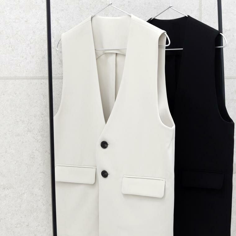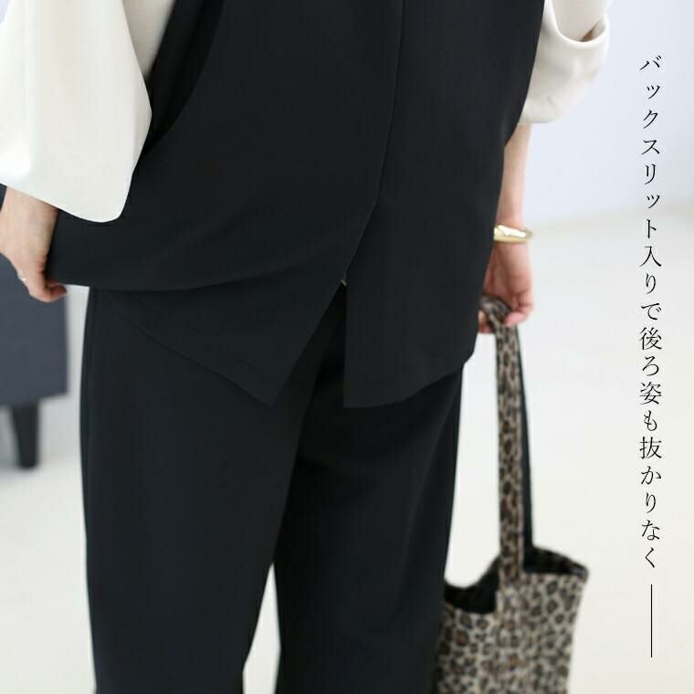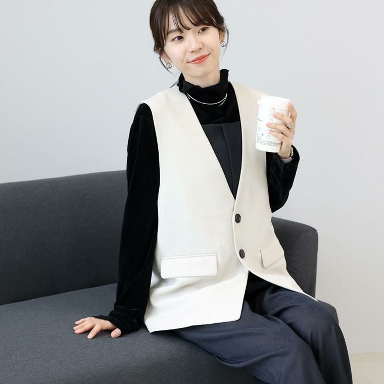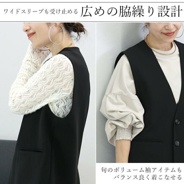 重ねるだけで装いが整う、「プラス1」アイテム。シンプルながらもさりげなく仕立ての良さが光る大人の為のベスト。控えめな艶感のエステルジョーゼット素材で、軽やかさと上品さを両立。裏地のない軽い着心地で長い季節着まわせます。しわになりにくく、お手入れが楽なのも魅力です。シームレスなノーカラー×深Vネックで、ブラウスともカットソーともバランスよく重ねられる。ワイドスリーブも受け止める広めの脇繰り設計で、旬のトップスとも相性抜群です。長めの着丈で腰回りを自然にカバーしスタイルアップ効果も期待。背裏付き&縫い目まで布帛で覆った仕立てで、裏側まで美しい仕上がりにこだわりました。日常使いからオフィス、きちんと感を求めるシーンまで幅広く着まわせる頼れるアイテムです。