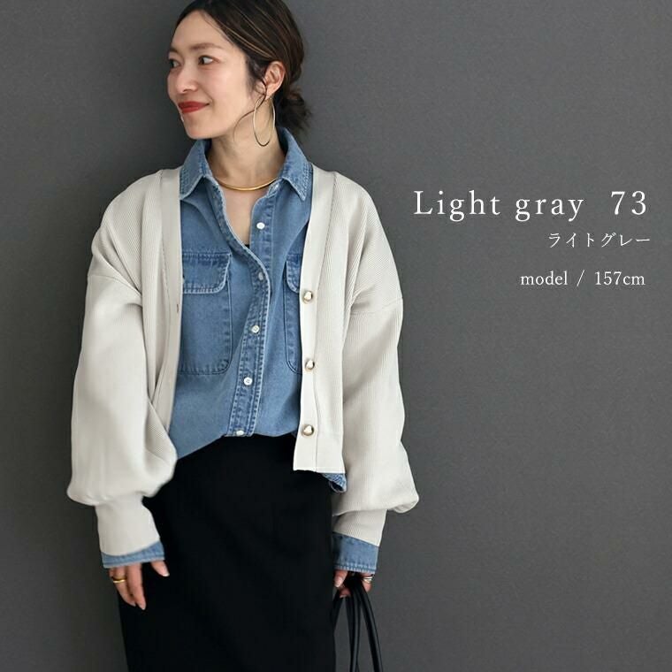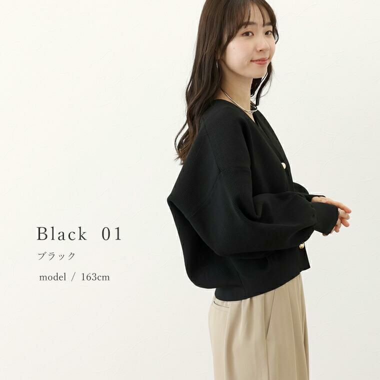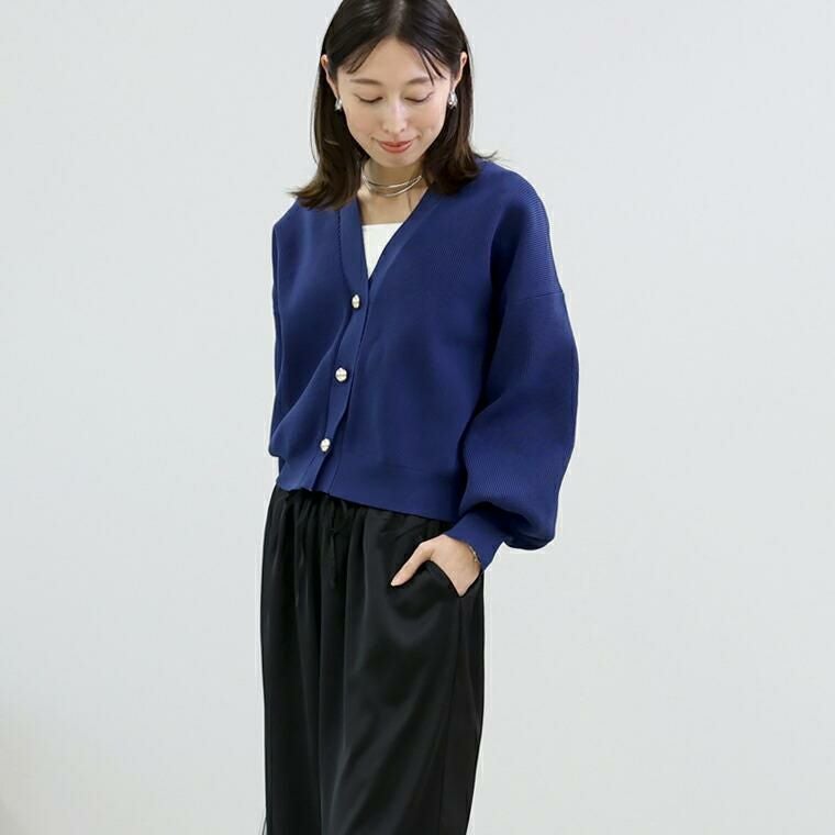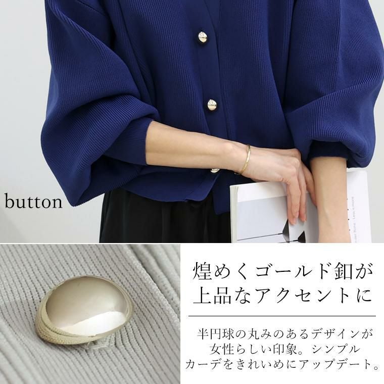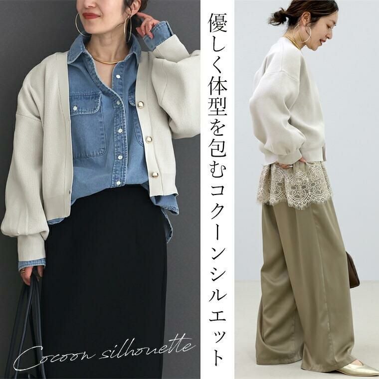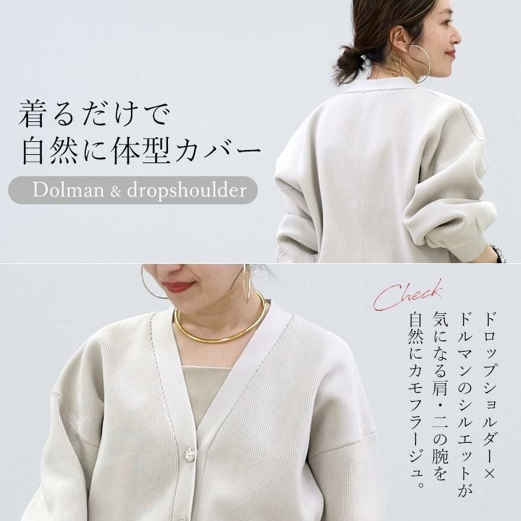 ポリニット素材で軽く、さらっとした着心地のVネックカーディガン。表情のある畦編みで仕立て、伸縮性にも優れリラックス。ロングシーズン活躍する素材感です。ドロップショルダー×ドルマンで、肩・二の腕周りを自然にカバー。ゆとりあるシルエットながら裾が窄まったコクーンが、着るだけで優しく体型を包みます。ぽってりとした袖は女性らしい柔らかさを演出。腕まくりをするとボリューム感がUPし、より華やかな印象に仕上がります。半円球の立体ゴールドボタンが上品なアクセント。前を留めても開けてもバランス良く着られ、幅広いスタイルにマッチ。大人の女性の日常にちょうどいい一枚です。