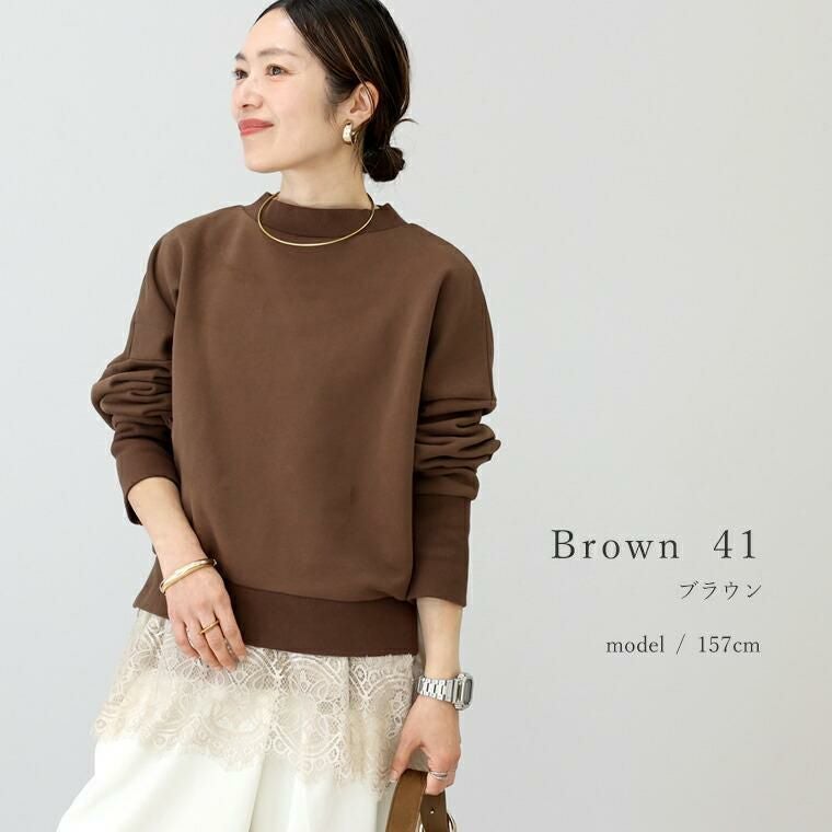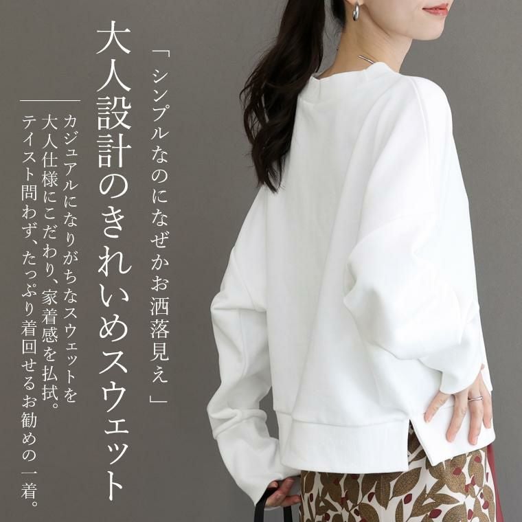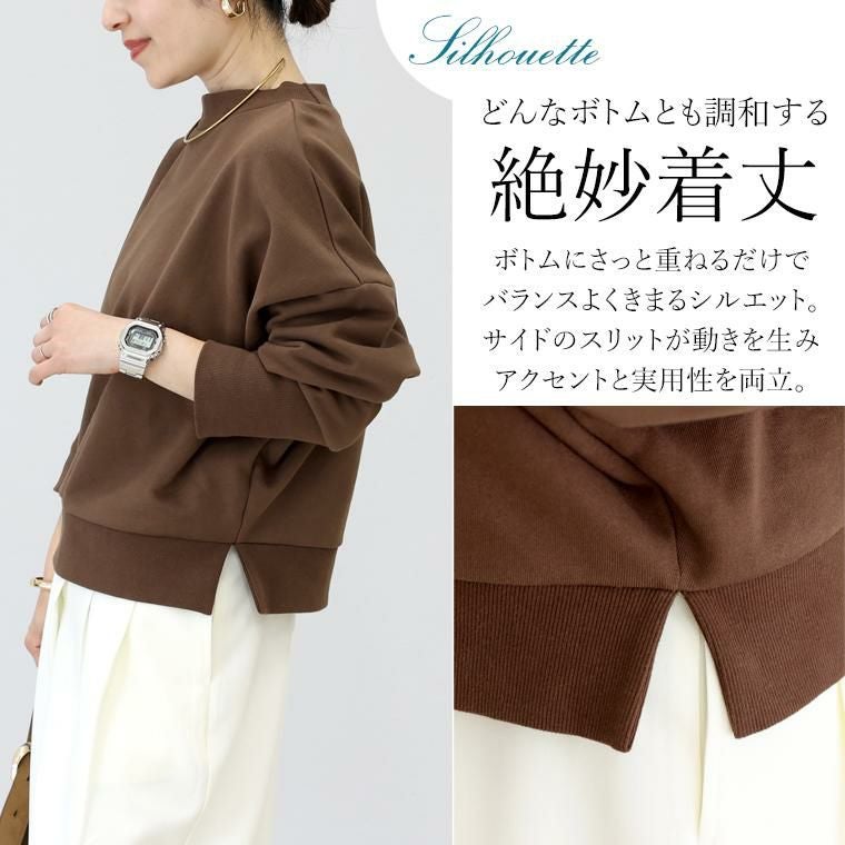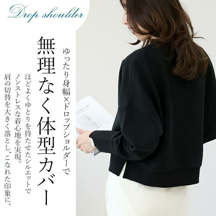 カジュアルになりがちなスウェットを大人の女性に似合うディテールできれいめに仕上げた一着。綿100%の上質素材を使用し、肌触りの良さと大人らしい品格を両立。ほどよいハリがシルエットを美しく整え、身体のラインを拾わず端正な佇まいに。やや広くとったネックは顔周りを上品に演出。襟・袖口・裾のリブにはポリウレタンを織り込むことで型崩れしにくく長く愛用できるようこだわりました。ゆったり身幅×ドロップショルダーで無理なく体型カバー。どんなボトムとも調和する着丈のバランスも絶妙です。裾のサイドにはスリットをあしらい軽さをプラス。腰まわりに窮屈感を与えず、重ね着もおすすめです。上質なベーシックカラーでまとめ、春まで長く活躍する大人の定番トップスです。
