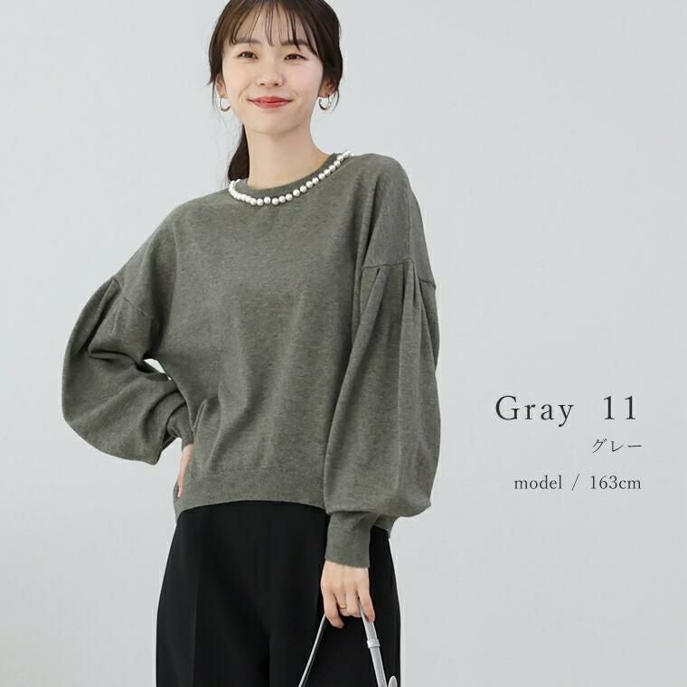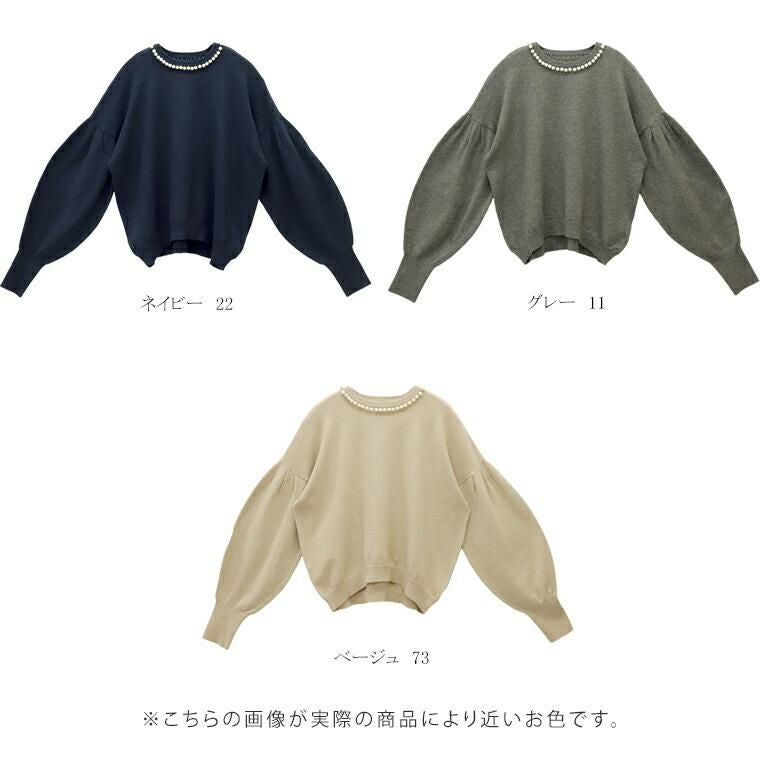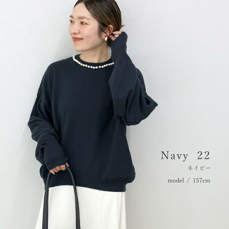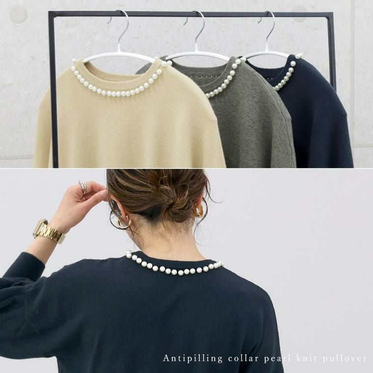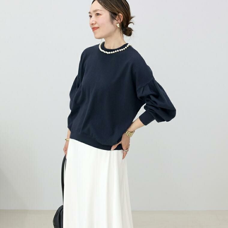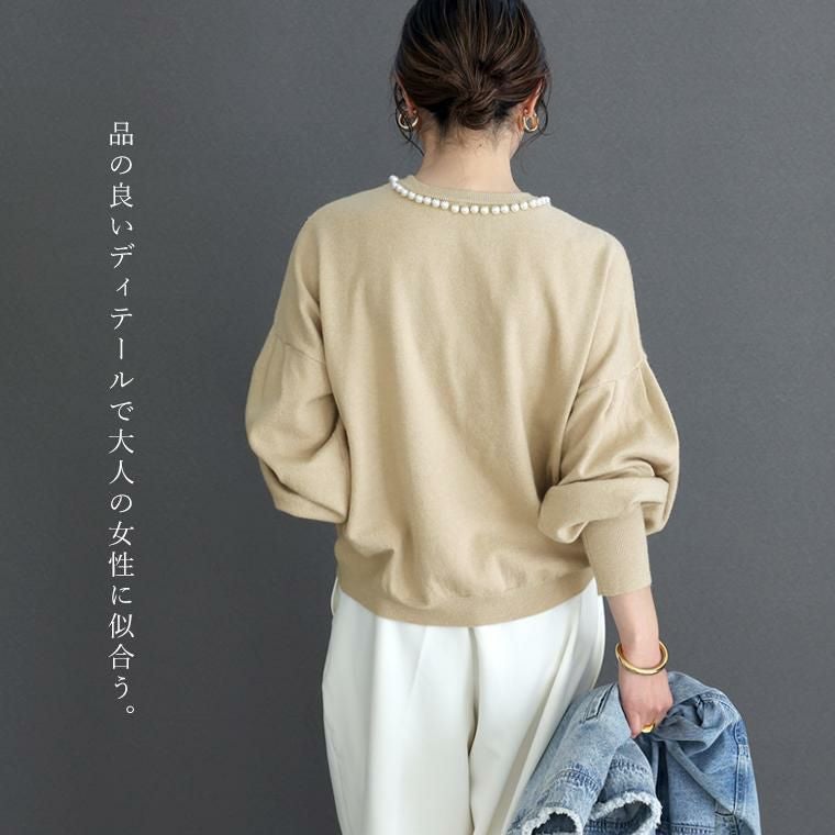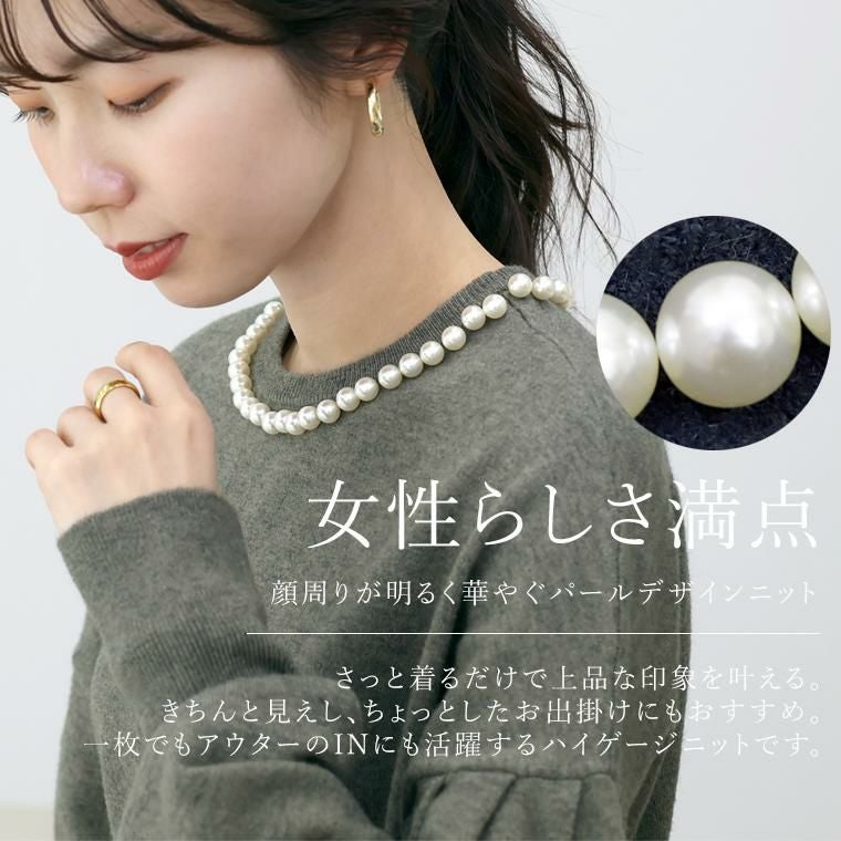 柔らかなハイゲージニットで仕立てたプルオーバー。襟周りに並んだパールがアクセサリー要らずで360度どこから見ても華やかな印象を与えます。ニットはアンチピリング加工を施し、綺麗が長続き。自宅でのお洗濯も可能でお手入れが楽なのも魅力です。一枚ではもちろん、羽織りのINに合わせた時もパールが覗きしっかり着映えます。ぽわんとした人気のボリューム袖もポイント。袖口はリブになっているので腕まくりもでき、日常生活にストレスを与えません。ゆとりある身幅にもたつきづらい丈感でパンツにもスカートにもフィット。女性らしさ満点の華やぎトップスです。