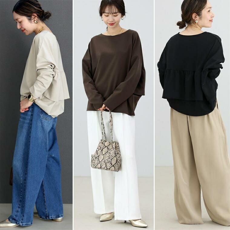 楽してきちんと見え。当店大人気素材ポンチで仕立てたバックフリルプルオーバーの登場。一見シンプルなデザインながら、後ろ身頃に施されたフリルデザインが華やか。フェミニンな印象のフリルも位置にこだわり、子供っぽくならず、それでいて重心が下がらないよう計算しました。生地を重ねることで気になる背中のラインをカモフラージュしてくれる効果も。ゆったり着られる定番のドルマンで窮屈感なく、体型カバーに一役買ってくれます。裾に向かってほんのり窄まるコクーンシルエットで腰まわりに優しくフィット。あれこれ考えずボトムに重ねるだけでバランスよく着こなせます。後ろ姿で差をつける主役トップスです。