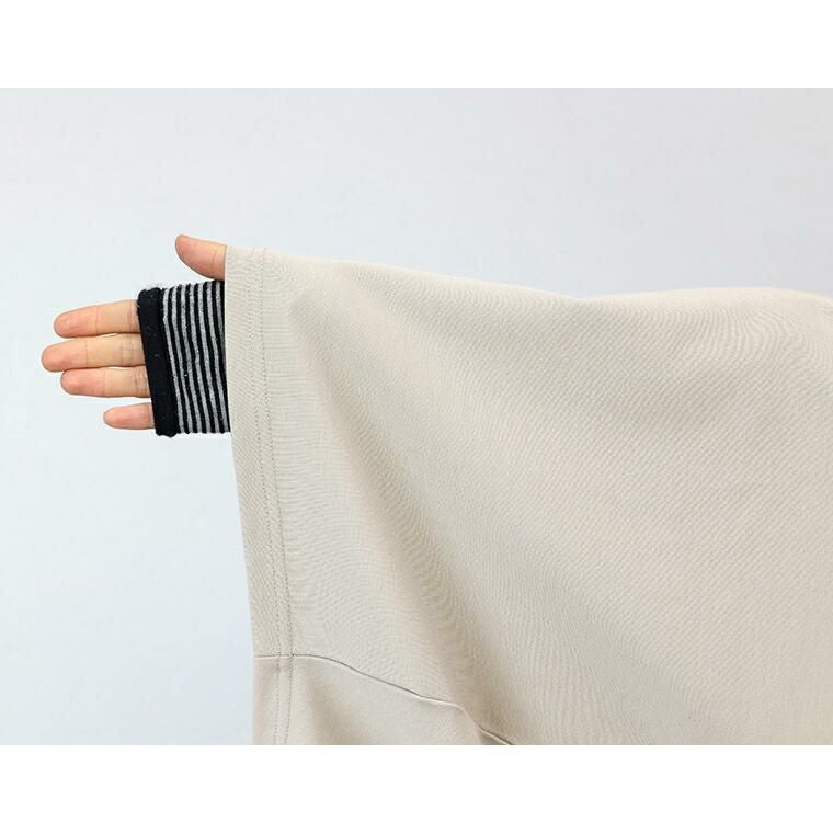 着丈はヒップがスッポリ隠れるくらい。袖丈は手首から14cm下。身幅がゆったりしていて楽です。襟ぐりは大きく開いていてスムーズに着脱ができました。ゆったりしていてますが裾に向けて窄まっているのでシルエットはすっきりしています。
