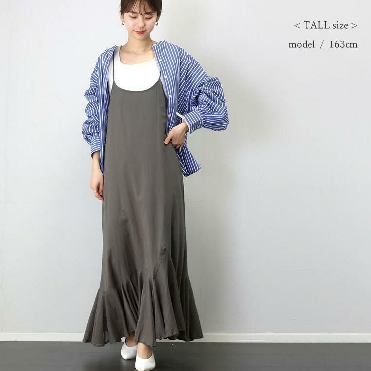 Mサイズの肩紐を真ん中くらいにして着ると床にズることなくマキシ丈で着る事が出来ました。身幅は程よくゆとりがあり薄手のカットソーなら楽に合わせられると思います。ヒップのラインも出ず軽く涼しい着心地です。TALLサイズは肩紐を一番短くすれば床にズらずに着れますがかなり上の位置で着ることになり、上に詰まった感じや背中に変なシワが入ってしまいました。私はMサイズで肩紐を調節して着たいです。