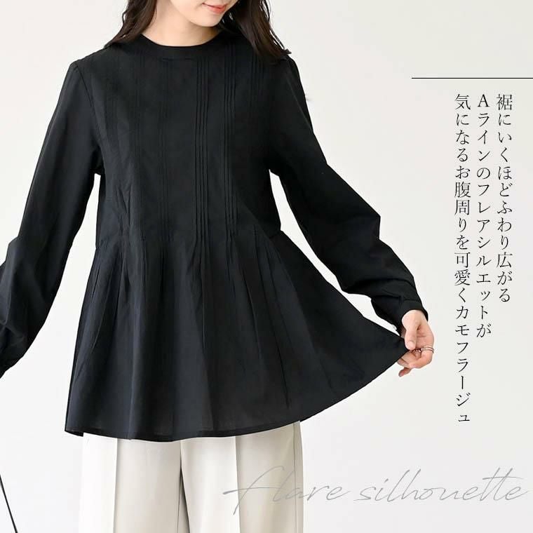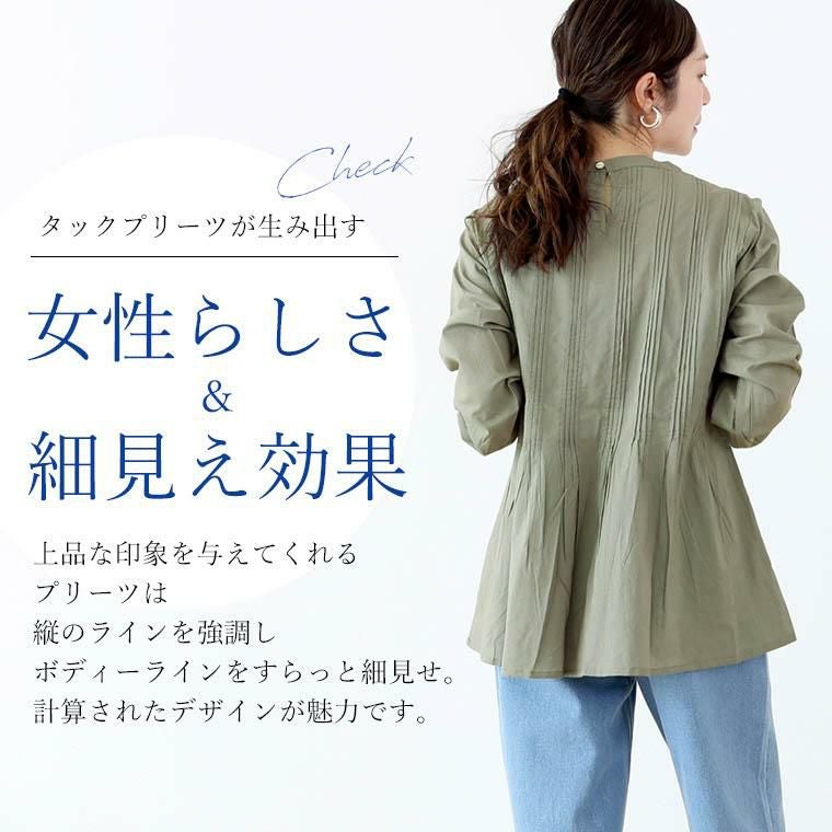 前後身頃に丁寧にあしらわれた、タックプリーツが女性らしさを引き出すデザインブラウス。清楚できちんと感ある印象を与えると同時に、プリーツが縦ラインを強調し上半身をすっきり細見せしてくれる効果も。プリーツから下は、裾に向かって広がるフレアシルエットでフェミニンさをアピール。気になるお腹周りもふんわりカバーしてくれます。素材は、通気性良く肌あたりも優しいコットン生地。さらりとしたナチュラルな風合いで着心地も軽く、リラックス。シンプルなボトムに合わせるだけでお洒落が加速するレディライクなデザインブラウスです。