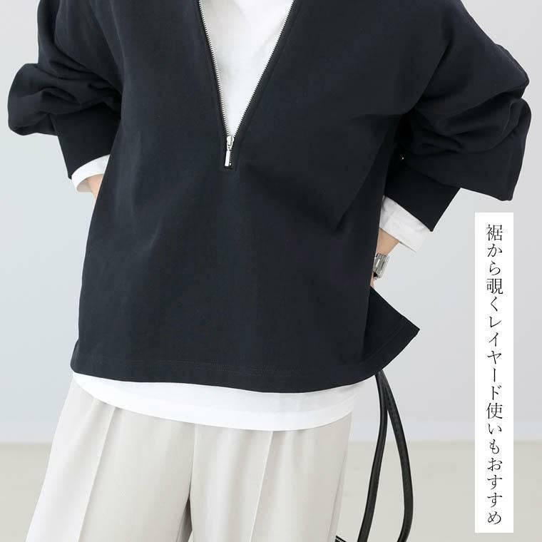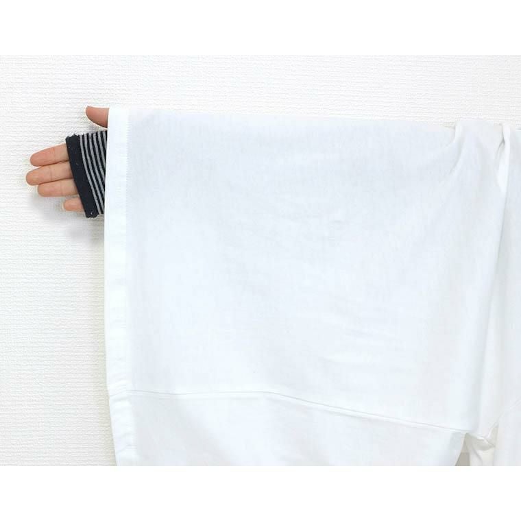 着丈はヒップが丁度隠れるくらい。袖丈は手首から15cm下。襟ぐりが広めでインナーが少し見えます。薄手で程よいゆとりがあり長い季節着れそうです。