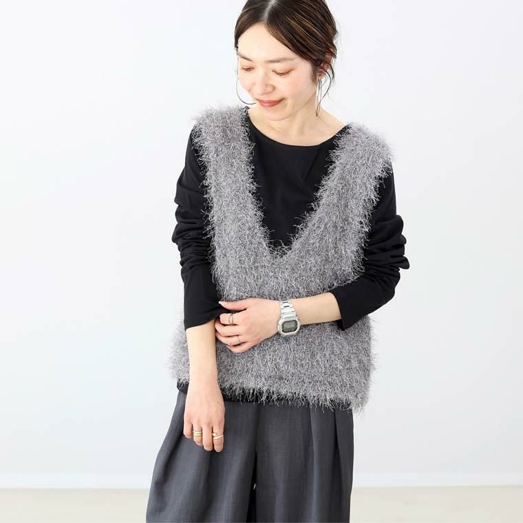 着丈はヒップが少し出るくらい。袖丈は手首から15cm下。全体的に程よくゆとりがありピッタリし過ぎないシルエットです。インナー使いにも使いやすいサイズで丁度良いサイズ感です。