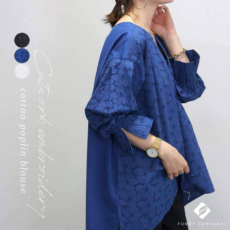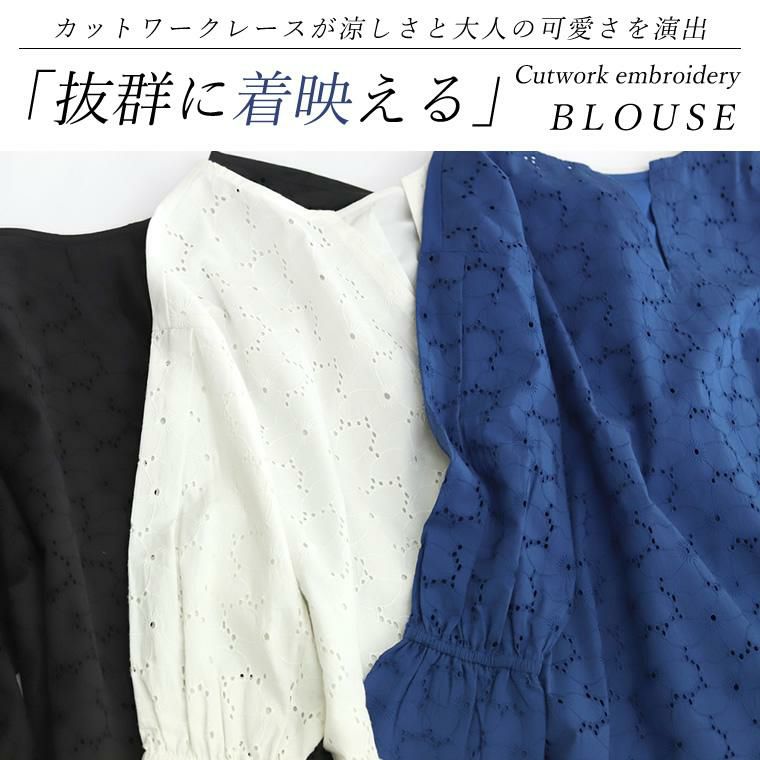 コットンポプリンカットワーク刺繍ブラウス 着映え感抜群、丁寧な刺繍生地が目を惹く主役ブラウス。 カットワーク刺繍が華やかで、大人が着やすいよう甘くなりすぎない レースに仕上げました。シルエットはボリュームが出過ぎないワイド。 ドロップショルダーでゆったりと着られます。長さがあり、気になる ヒップラインを隠してくれるのも嬉しいポイントです。 ぽわんとした立体袖もこだわり。袖口にはゴムが入っているので きゅっとたくし上げてお好みのシルエットに調節が可能。日常動作にも便利です。 360度どこから見てもサマ見え、レディーが加速する一着です。