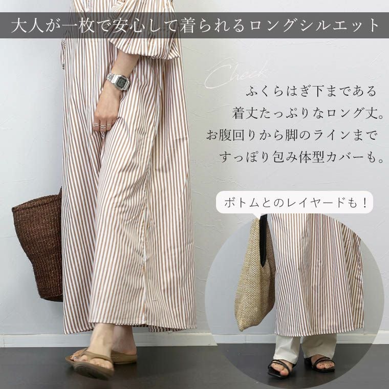 着丈はくるぶしから1cm上。袖丈は手首から11cm下。全体的に私にはかなり大きく感じます。素材はサラッとしていて軽く薄いので体に張り付かず涼しく着れそうです。袖が長めで身幅もあるので身長の低い方だと着られてる感がありますが、ストライプで縦長効果はありそうです。