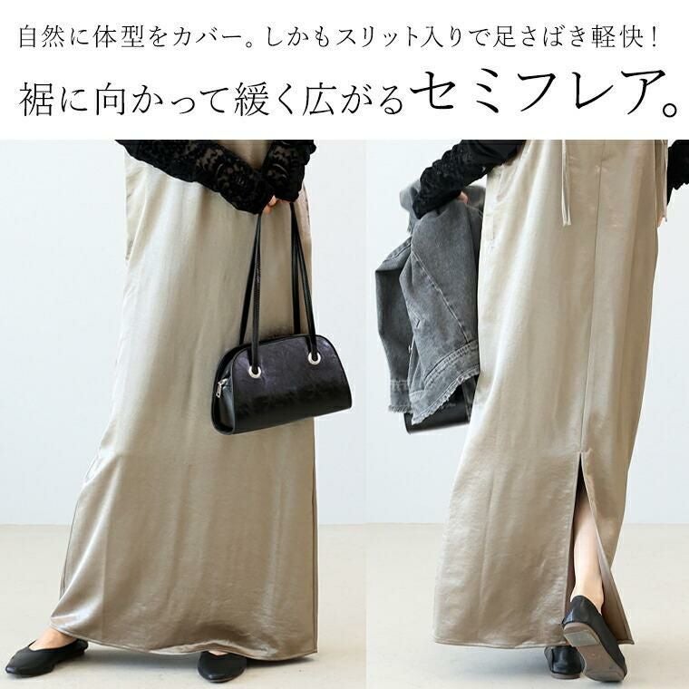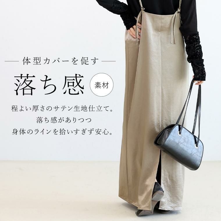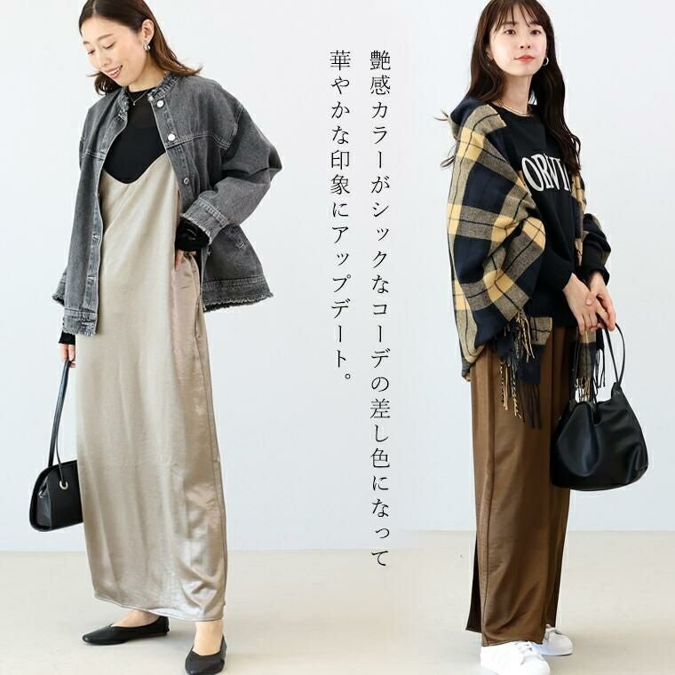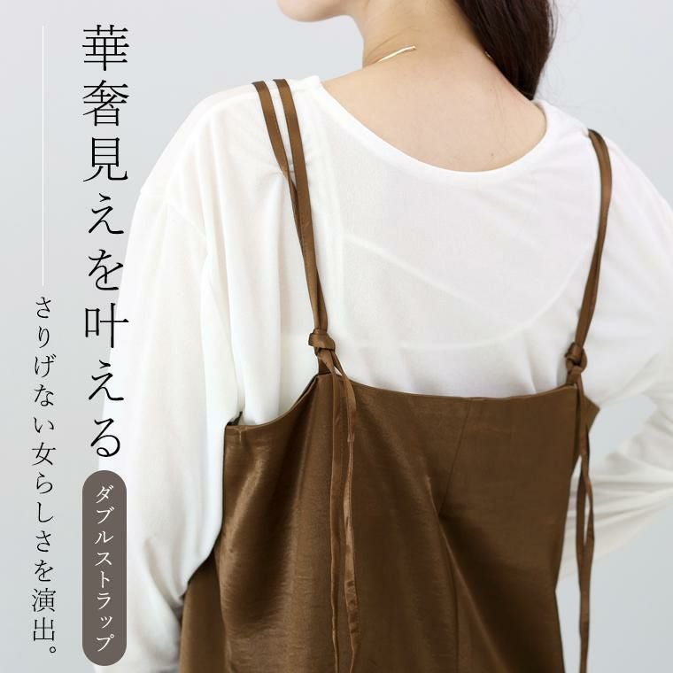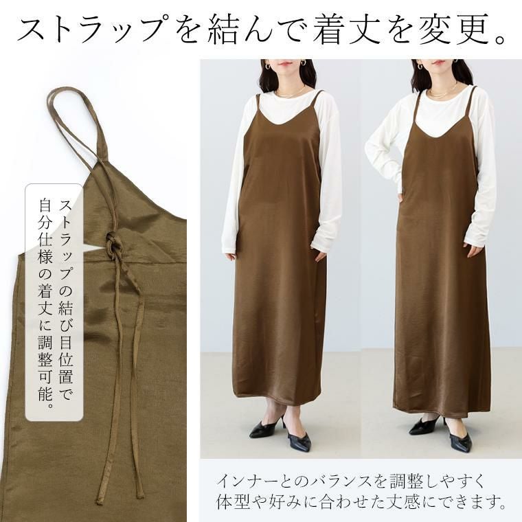 光沢のあるサテン生地が、上品さと華やかさをプラスするキャミソールワンピース。程よい厚さの素材で、落ち感がありつつ身体のラインを拾いすぎず安心シルエットです。インナー次第で通年着まわせる汎用性の高さが魅力。華奢見えするダブルストラップがさりげない女らしさを演出、ストラップの長さは結び目で調整できるので、お好みの丈感で着られます。裾に向かって広がるセミフレアシルエットが、自然に体型をカバーしつつ、裾にはスリットがはいっているので足さばき楽&抜け感ある印象に。一枚ではもちろん、重ね着でロングシーズン楽しめる万能ワンピースです。
